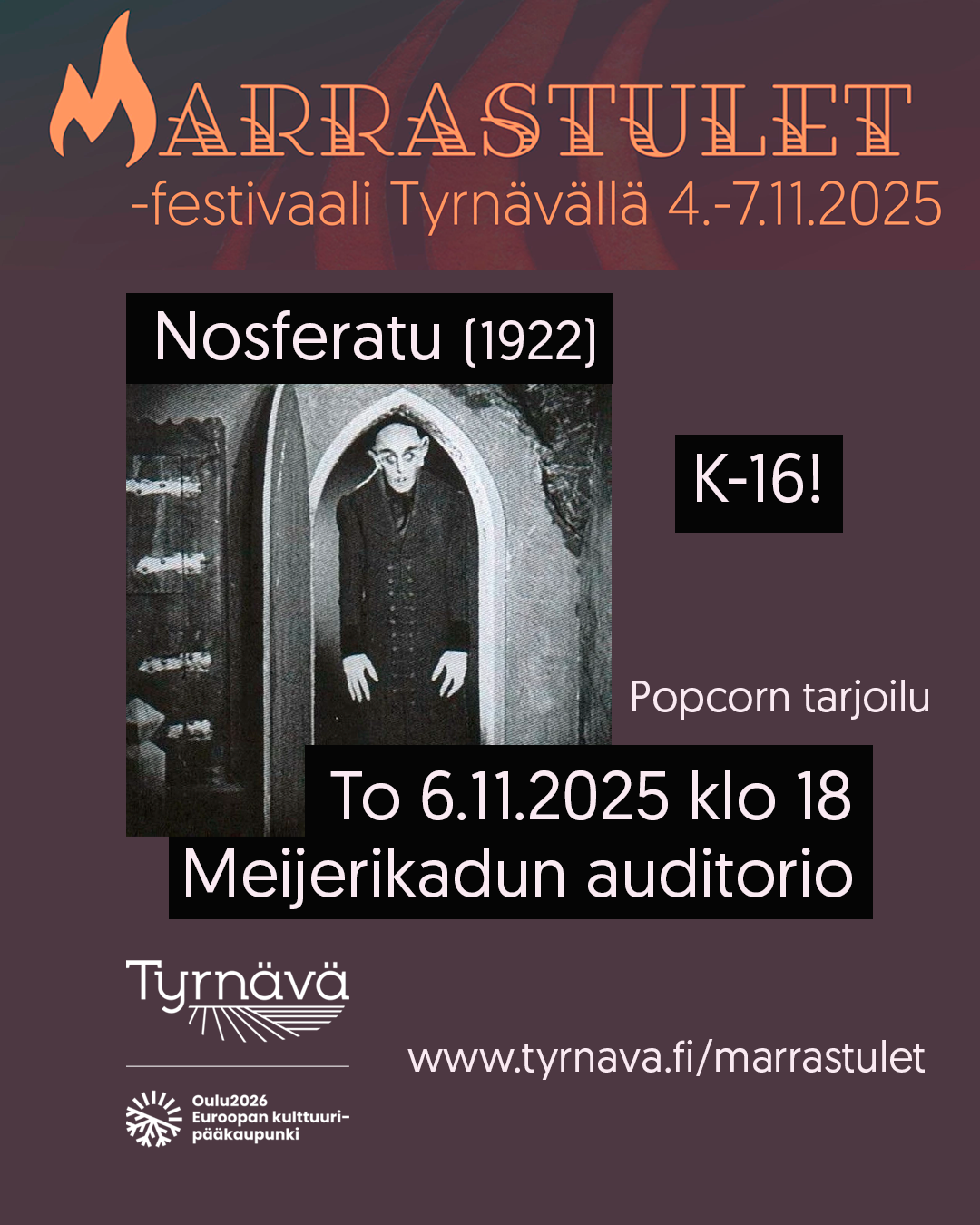 06.11.2025 18:00 - 06.11.2025 20:00 Marrastulet-festivaalin ohjelmistoa: Kauhuelokuvaklassikko Nosferatu (1922) Meijerikadun auditoriossa. To 6.11.2025 klo 18. To 6.11.2025 klo 18 Kauhuelokuvaklassikko Meijerikadun auditoriossa. Saksalaisen F.W. Murnaun Nosferatu vuodelta 1922 on vampyyrielokuvien ikoninen klassikko ja todennäköisesti kuuluisin tulkinta Bram Stokerin romaanista Dracula. Max Schreckin esittämä kreivi Orlok on toiminut esikuvana myöhemmille vampyyrielokuville ja kauhistuttanut yleisöjä jo yli sadan vuoden ajan! Kesto 95 min. Popcorn ja mehu tarjoilu. Vapaa pääsy. Huom! Ikärajallinen tapahtuma. K-16.