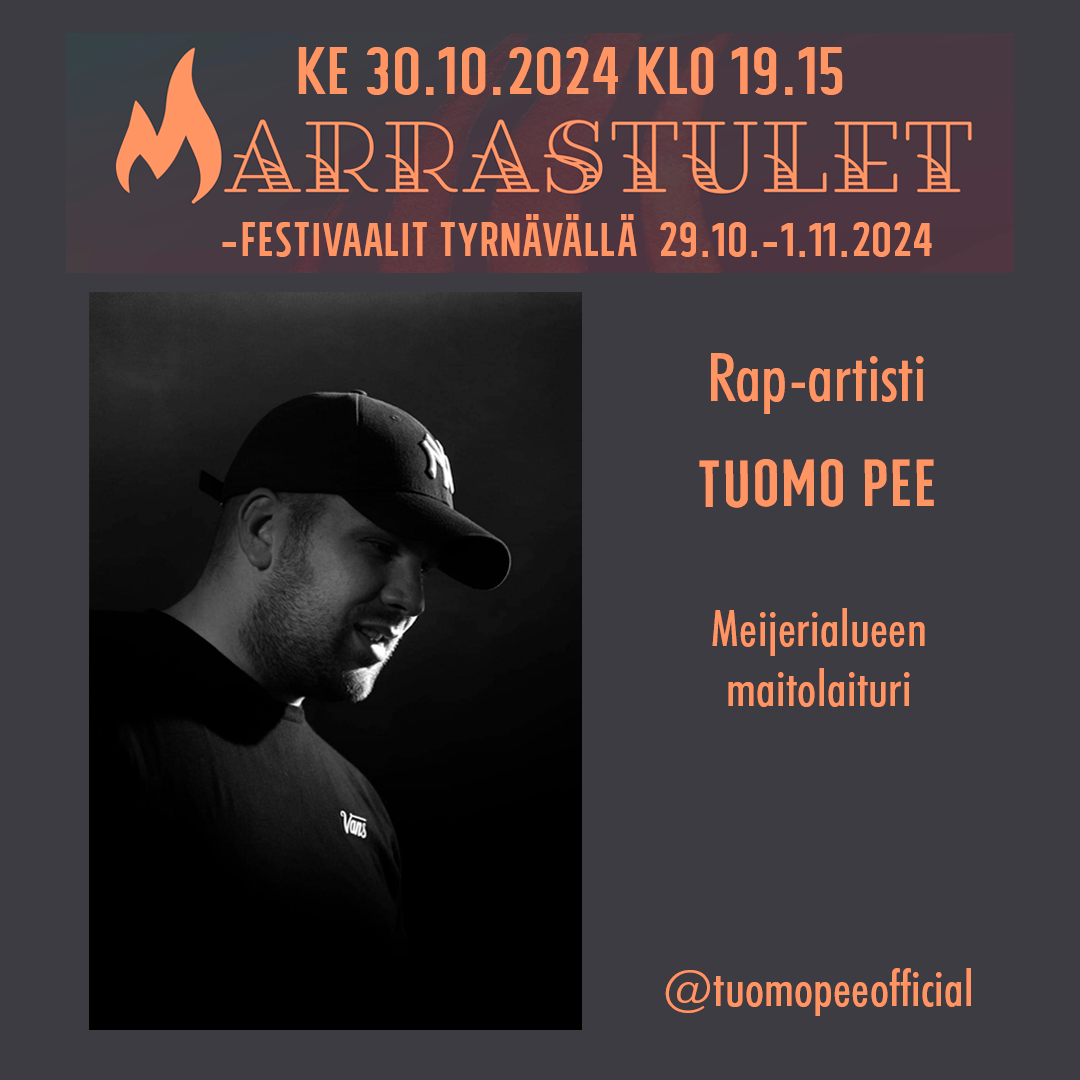 Marrastulet-festivaalin ohjelmistoa: Rap-artisti Tuomo Pee! Ke 30.10.2024 klo 19.15 Meijerialueen maitolaituri.
