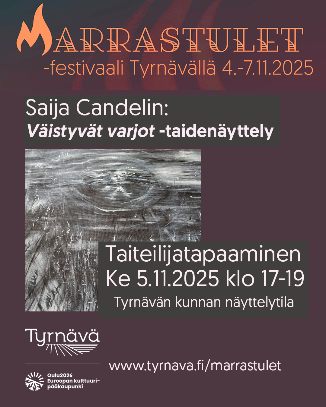 05.11.2025 17:00 - 05.11.2025 19:00 Marrastulet-festivaalin ohjelmistoa! Taiteilijatapaaminen: Saija Candelin. Tyrnävän kunnan näyttelytila. Ke 5.11.2025 klo 17–19 Marrastulet-festivaalin ohjelmistossa ke 5.11.2025 klo 17–19 Tyrnävän kunnan näyttelytilassa Taiteilijatapaaminen: Saija Candelin Tule tapaamaan taiteilijaa paikan päälle ja ihastumaan samalla Väistyvät varjot -taidenäyttelyyn. www.artbysaija.com