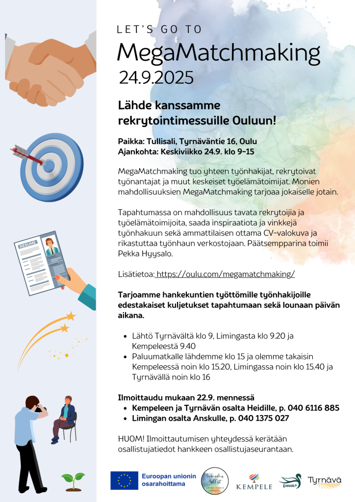 24.09.2025 09:00 - 24.09.2025 15:00 MegaMatchmaking-rekrytointitapahtuma Lakeuden Sillat -hanke järjestää yhteisretken MegaMatchmaking-rekrytointitapahtumaan keskiviikkona 24.9. klo 9–15. Tapahtuma on Oulussa Tullisalilla, os. Tyrnäväntie 16. Hanke tarjoaa hankekuntien työttömille työnhakijoille edestakaiset kuljetukset tapahtumaan sekä lounaan päivän aikana. Aikataulu: Lähtö Tyrnävältä klo 9, Limingasta klo 9.20 ja Kempeleestä 9.40. Paluumatkalle lähdemme klo 15 ja olemme takaisin Kempeleessä noin klo 15.20, Limingassa noin klo 15.40 ja Tyrnävällä noin klo 16. Ilmoittautuminen 22.9. mennessä Kempeleen ja Tyrnävän osalta Heidille, p. 040 611 6885 Limingan osalta Anskulle, p. 040 137 5027 HUOM! Ilmoittautumisen yhteydessä kerätään osallistujatiedot hankkeen osallistujaseurantaan.
