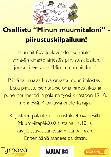 17.09.2025 17:01 - 12.10.2025 21:00 "Minun muumitaloni" -piirustuskilpailu Piirrä tai maalaa kuva omasta muumitalostasi. Lisää piirustuksen taakse oma nimesi, ikäsi sekä puhelinnumero ja palauta työsi kirjastoon 12.10. mennessä. Kirjastoon palautetut työt ovat esillä Muumi-iltapäivässä tiistaina 14.10., jolloin kävijät saavat äänestää niistä parhaan. Eniten ääniä saaneet palkitaan muumiaiheisella palkinnolla.