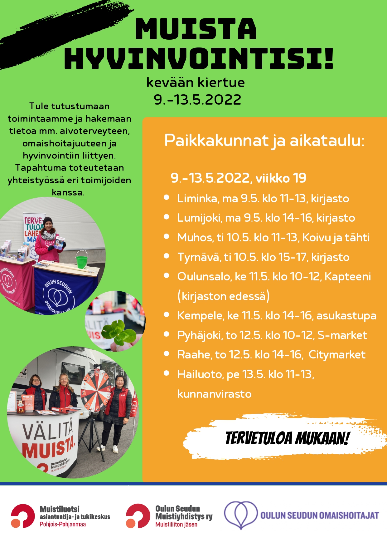 10.05.2022 15:00 - 10.05.2022 17:00 MUISTA HYVINVOINTISI! Muista hyvinvointisi! -kiertue Tyrnävän kirjastossa tiistaina 10.5. klo 15–17. Aivoterveysonnenpyörä, tietoa hyvinvoinnista, muistista ja omaishoitajuudesta. Tervetuloa!