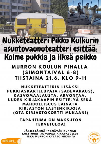 21.06.2022 09:00 - 21.06.2022 11:00 Murron koulun pihalla: Nukketeatteri Pikku Kulkurin asuntovaunuteatteri esittää: Kolme pukkia ja ilkeä peikko Nukketeatteri Pikku Kulkurin asuntovaunuteatteri Murron koulun pihalla tiistaina 21.6. klo 9–11. Asuntovaunuteatterissa esitetään näytelmää Kolme pukkia ja ilkeä peikko non-stoppina kahden tunnin ajan. Asuntovaunussa on pienoiskatsomo noin kymmenelle hengelle kerrallaan. Asuntovaunun edustalla on pukkipaja, jossa lapset voivat omaa vuoroaan odotellessaan askarrella oman pukin (sadevaraus, pieni sade ei haittaa, mutta kaatosateen sattuessa pukkipajaa ei järjestetä). Tapahtumassa on lisäksi kasvomaalausta, uuden kirjakaapin esittelyä ja mahdollisuus lainata kirjaston lastenkirjoja (ota kirjastokortti mukaan!). Arvomme kaikkien kävijöiden kesken kirjapalkinnon. Tapahtuma on maksuton, tervetuloa! Järjestäjinä Tyrnävän kunnan kulttuuri- ja vapaa-aikapalvelut sekä Murron kylätoimikunta.