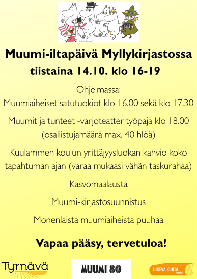 14.10.2025 16:00 - 14.10.2025 19:00 Muumi 80 vuotta -iltapäivä Myllykirjastossa Muumi-iltapäivä Myllykirjastossa ti 14.10. klo 16–19 Ohjelmassa: Muumiaiheiset satutuokiot kello 16 ja 17.30. Muumi ja tunteet -varjoteatterityöpaja klo 18 (osallistujamäärä max. 40 henkilöä) 4–8-vuotiaat aikuisen seurassa (muuten soveltuu kaikille yli 4-vuotiaille) Kuulammen koulun 9D-yrittäjyysluokan kahvila koko tapahtuman ajan. Varaa mukaasi taskurahaa. Muumi-kirjastosuunnistusta Kasvomaalausta ja muuta muumiaiheista puuhaa Minun muumitaloni -piirrustuskilpailun äänestys (Piirustuskilpailuun on voinut osallistua 12.10. saakka. Siitä erillinen ilmoitus tapahtumakalenterissa.) Vapaa pääsy, tervetuloa!