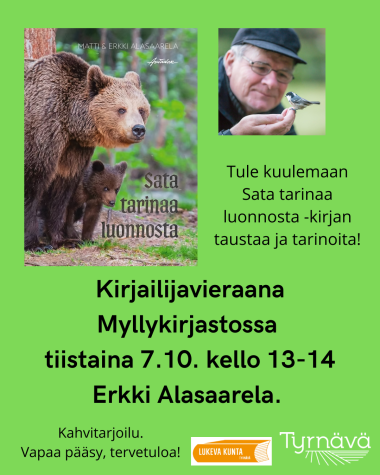 07.10.2025 13:00 - 07.10.2025 14:00 Myllykirjastossa kirjailijavieraana Erkki Alasaarela Kirjailijavieraana Myllykirjastossa tiistaina 7.10. kello 13–14 Erkki Alasaarela. Erkki ja Matti Alasaarela ovat kätkeneet toukokuussa 2025 julkaistuun Sata tarinaa luonnosta -kirjaan mieleenpainuvimmat tarinat luontoretkiltään. Tule kuulemaan ja kokemaan kirjan taustaa ja tarinoita kirjailijan itsensä kertomana. Kahvitarjoilu. Vapaa pääsy, tervetuloa!