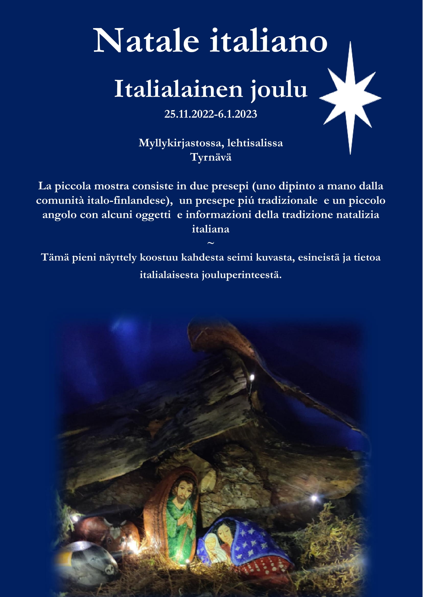 25.11.2022 12:00 - 05.01.2023 16:00 Natale italiano – Italialainen joulu -vitriininäyttely Natale italiano – Italialainen joulu -vitriininäyttely: näyttely koostuu kahdesta seimestä ja esittelee italialaisia jouluperinteitä. Esillä Myllykirjaston lehtisalissa 25.11.2022–6.1.2023 Näyttely on avoinna Myllykirjaston aukioloaikojen mukaisesti: ma–ke 12–19 to 9–16 pe 12–16 la 11–14 Poikkeusaukioloajat: ma 5.12. klo 12–16, ti 6.12. ja pe 16.12. suljettu