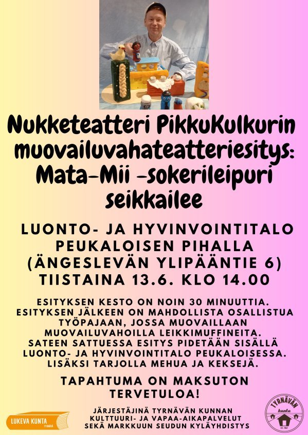 13.06.2023 14:00 - 13.06.2023 15:00 Nukketeatteri PikkuKulkuri Markkuulla Luonto- ja hyvinvointitalo Peukaloisen pihalla klo 14.00