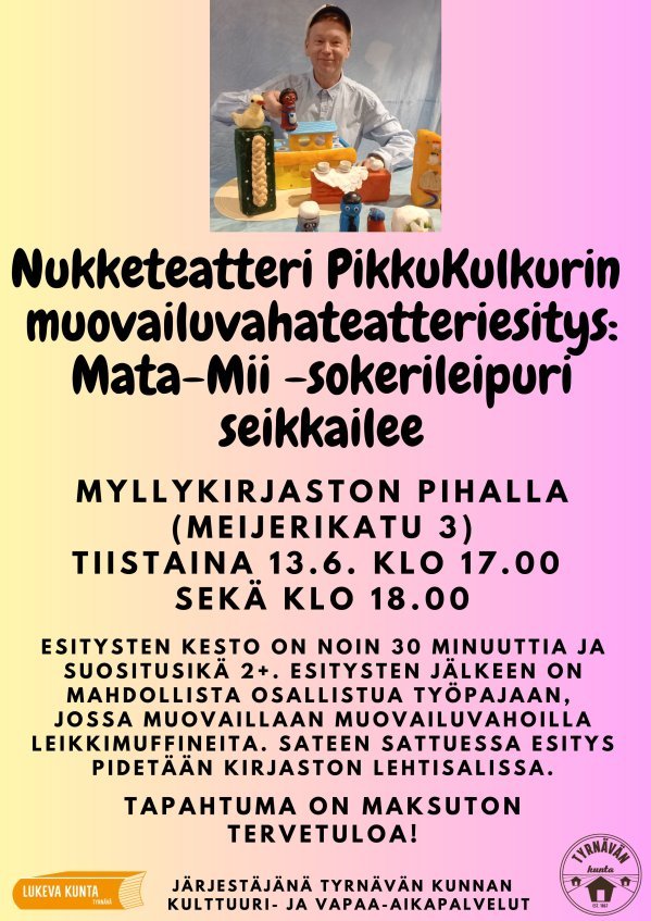 13.06.2023 17:00 - 13.06.2023 19:00 Nukketeatteri PikkuKulkuri Myllykirjaston pihalla klo 17.00 ja klo 18.00