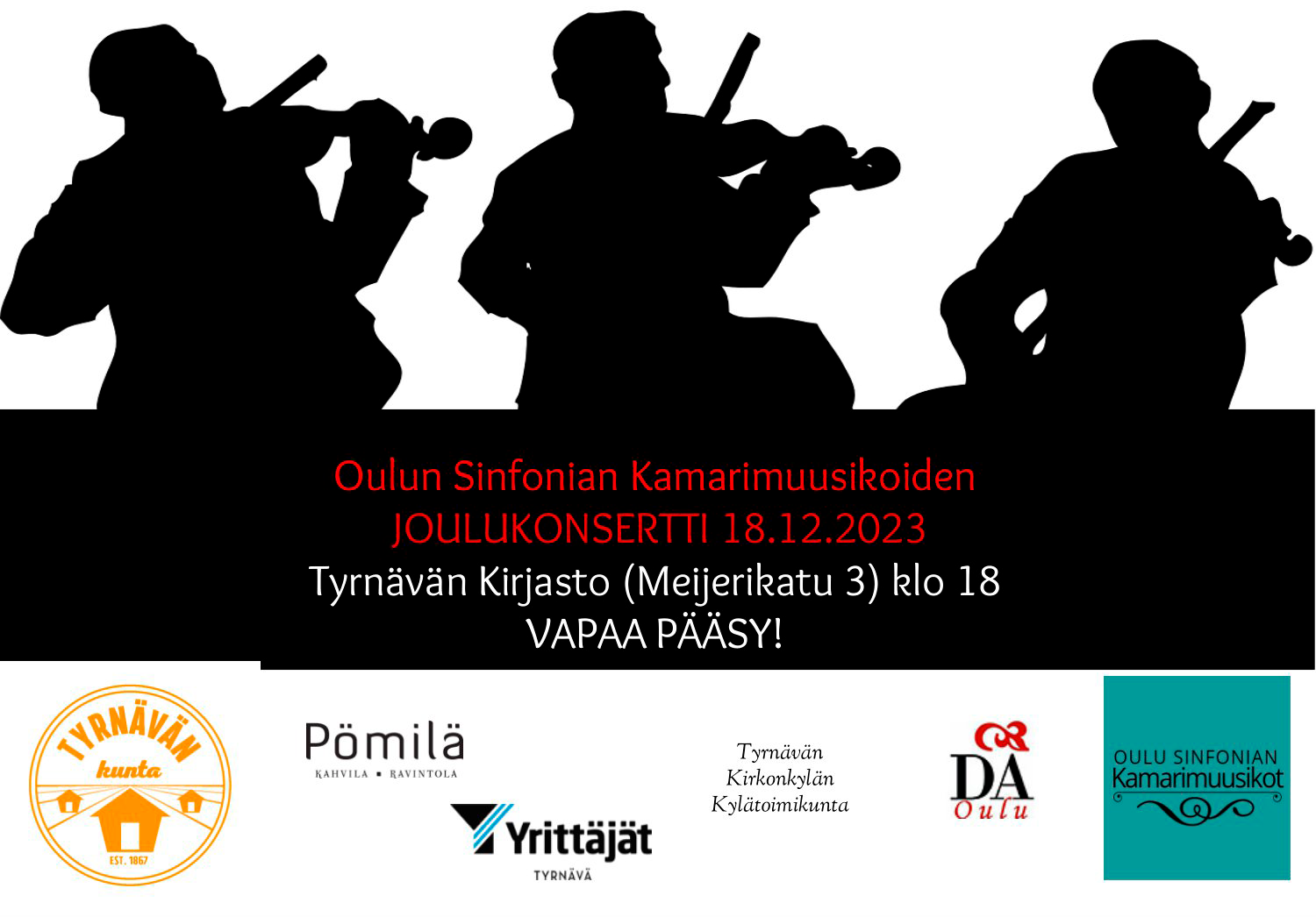 17.12.2023 18:00 - 17.12.2023 19:01 Oulu Sinfonian Kamarimuusikoiden joulukonsertti su 17.12.2023 klo 18 Myllykirjaston lehtisalissa Oulu Sinfonian Kamarimuusikoiden tunnelmallinen joulukonsertti sunnuntaina 17.12.2023 klo 18 Myllykirjaston lehtisalissa. Vapaa pääsy! Konsertti kestää noin tunnin. Lämpimästi tervetuloa. Huom! Käynti piipunpuoleisesta tai yhdyskäytävän ovesta! "Me Oulu Sinfonian kamarimuusikot emme malta odottaa, että pääsemme näkemään teidät kaikki joulukonsertissamme Tyrnävän Myllykirjastossa. Ethän jätä väliin mahdollisuutta jakaa unohtumattoman lämpöisiä, seesteisiä läheisyyden hetkiä rakkaimpiesi kanssa. Kuvittele tunnelmallinen ja viihtyisä huone itävaltalaisessa talossa: sen mukavat tuolit takkatulen edessä, paljon lunta ulkona, kauniita melodioita ilmassa ja käyrätorvi kuusen alla. Tervetuloa konserttiin!" Oulu Sinfonian Kamarimuusikot: Matias Nässi, käyrätorvi Mikko Sorri, viulu Panagiotis Nikolakis, viulu Emiliano Travasino, alttoviulu Anna Liukkonen, sello https://oulusinfonia.fi