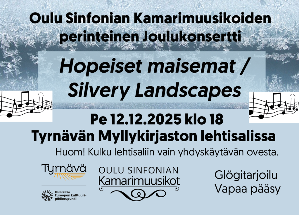 12.12.2025 18:00 - 12.12.2025 20:00 Oulu Sinfonian kamarimuusikoiden Joulukonsertti Hopeiset maisemat Myllykirjaston lehtisalissa pe 12.12.2025 klo 18 Oulu Sinfonian kamarimuusikoiden perinteinen joulukonsertti Myllykirjaston lehtisalissa pe 12.12.2025 klo 18! Hopeiset maisemat / Silvery Landscapes Hopeiset maisemat Oulu Sinfonian Kamarimuusikot Tyrnävän Myllykirjastossa Talvi-iltana Tyrnävällä musiikki kokoaa ihmiset yhteen, kun Oulu Sinfonian kamarimuusikot kutsuvat teidät Tyrnävän Myllykirjastoon kuulemaan ohjelman, joka on omistettu paikalliselle yhteisölle ja kaikille Oulun seudun asukkaille. Ilta tuo kuulijalle kauneuden, rauhan ja yhdessäolon kokemuksen ainutlaatuisen inspiroivassa ympäristössä. Jousikvartetti maalaa sävelillään hopeisia maisemia ajatuksiin, johdattaen kuulijat matkalle, jossa hiljaisuus puhkeaa soinnuksi ja talven tyyneys avautuu lämmöksi. Ohjelma kietoo yhteen meditatiivisia adagioita, pastoraalisia näkymiä, ajattomia joululauluja ja joulun juhlavuutta. Se virtaa sulavasti hiljaisuuden ja hartauden pohdinnoista talvimaisemien valisevaan rauhaan, yhdistäen perinteen ja uudistumisen. Lämmin kiitos Tyrnävän kunnalle, Ravintola Pömilälle, Tyrnävän Yrittäjille ja Tyrnävän Kirkonkylän kylätoimikunnalle ohjelman tukemisesta ja luottamuksesta meihin. Tervetuloa. Vapaa pääsy! Glögitarjoilu! HUOM! Kulku lehtisaliin vain yhdyskäytävän oven kautta. Ohjelma: Joulukauden valikoima Oulu Sinfonian Kamarimuusikot: Miia-Karoliina Vettenranta, viulu Laura Kangas, viulu Helinä Nissi, alttoviulu Greta Ernesaks, sello Silvery landscapes Oulu Sinfonia Chamber Musicians at Tyrnävä Mill Library December 12. 2025 18:00 On a winter evening in Tyrnävä, music becomes a gathering place for all. The Oulu Sinfonia Chamber Musicians invite you to the Tyrnävä Mill Library for a program dedicated to the local community and everyone in the Oulu region, offering an experience of beauty, peace, and togetherness in a uniquely inspiring setting. A string quartet will paint silver landscapes of the mind, guiding listeners on a journey where silence blossoms into sound and the stillness of winter opens into the warmth of sharing. The program weaves together meditative adagios, pastoral visions, timeless carols, and festive echoes of Christmas. It flows gracefully from reflections on silence and devotion to the luminous peace of winter landscapes, blending tradition with renewal. We extend our heartfelt thanks to Tyrnävä Municipality, Ravintola Pömilä, Tyrnävän Yrittäjät, and Tyrnävän Kirkonkylän Kylätoimikunta for supporting this program and placing their trust in us. Welcome. Free entry! Hot glogg available! Please kindly note that access to the library is only through the corridor door. Program: Christmas selection Oulu Sinfonia Chamber Musicians: Miia-Karoliina Vettenranta, violin Laura Kangas, violin Helinä Nissi, viola Greta Ernesaks, cello