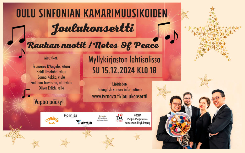 15.12.2024 18:00 - 15.12.2024 20:00 Oulu Sinfonian Kamarimuusikoiden joulukonsertti Rauhan nuotit/Notes of Peace Myllykirjastolla 15.12.2024 klo 18 Oulu Sinfonian Kamarimuusikoiden perinteinen joulukonsertti Myllykirjastolla 15.12.2024 klo 18 Suuren suosion saavuttanut Oulu Sinfonian Kamarimuusikoiden upea joulukonsertti järjestetään tänäkin jouluna Tyrnävällä. Paikkana on tuttuun tapaan Myllykirjaston lehtisali. Paikkoja on rajoitetusti, joten saavuthan paikalle hyvissä ajoin. Konsertin kesto noin 1 tunti 45 min, sisältäen väliajan. Tarjolla lämmintä juomaa. Vapaa pääsy. Lämpimästi tervetuloa! Rauhan Nuotit Tämä iltapäiväkonsertti päättää Oulu Sinfonian Kamarimuusikoiden 2024 kauden, ja se toteutetaan yhteistyössä Tyrnävän kunnan, NOCMAn (Pohjois-Pohjanmaan Kamarimusiikkiyhdistys ry) sekä paikallisten sponsoreiden kanssa. Konsertin ohjelma koostuu harvoin esitetyistä teoksista kitaralle ja jousille, jotka varmasti luovat konserttipaikalle rauhallisen, iloisen ja lämpimän tunnelman. Säveltäjä Luigi Boccherini oli yksi merkittävimpiä italialaisia instrumentaalimusiikin säveltäjiä 1700-luvun jälkipuoliskolla, ja tämän illan konsertissa kuulemme hänen kolme kauneinta kvintettoa jousille ja kitaralle. Näiden teosten lisäksi kuulemme Vivaldin konserton, joka on alunperin sävelletty luutulle ja kahdelle viululle. Näiden teosten hitaiden osien poikkeuksellinen kauneus, sekä nopeiden osien valoisuus ja elämänilo ovat omiaan kuljettamaan kuulijansa joulutunnelmaan. Oulu Sinfonian Kamarimuusikot saavat konserttiin vieraakseen loistavan italialaisen kitaristin Francesco D’Angelon. Lämpimästi tervetuloa! Oulu Sinfonian Kamarimuusikot: Francesco D'Angelo, kitara Heidi Ilmolahti, viulu Sanna Kokko, viulu Emiliano Travasino, alttoviulu Oliver Erlich, sello Notes of Peace This evening’s concert concludes the 2024 season of Oulu Sinfonian Chamber Musicians, in collaboration with Tyrnävä Municipality, NOCMA (Northern Ostrobothnian Chamber Music Association) and other local sponsors. The program of the concert aims to create a peaceful, joyous and warm atmosphere through rarely performed chamber music for guitar and strings. Luigi Boccherini was one of the greatest exponents of Italian instrumental music during the second half of the eighteenth century and this evening, three of his most beautiful quintets for guitar and strings will be performed, along with a concerto by Vivaldi originally written for lute and two violins. Throughout the program, the slow movements of extraordinary beauty and the fast movements full of light and vitality will offer the opportunity for the audience to experience emotions and sound images particularly evocative of Christmas. The Oulu Sinfonia Chamber Musicians will be joined by the wonderful Italian guitarist Francesco D'Angelo. Welcome! Oulu Sinfonia Chamber Musicians: Francesco D'Angelo, guitar Heidi Ilmolahti, violin Sanna Kokko, violin Emiliano Travasino, viola Oliver Erlich, cello Duration: 1 h 45 min, including the intermission. Free admission. Hot drink available. Welcome!