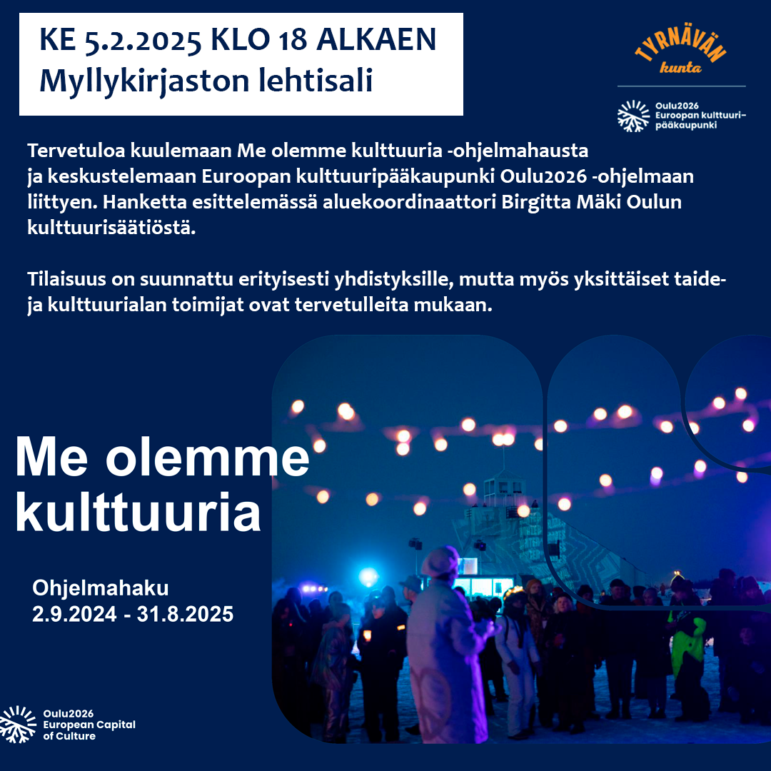 05.02.2025 18:00 - 05.02.2025 19:30 Oulu2026: Me olemme kulttuuria -ohjelmahaun esittely Myllykirjaston lehtisalissa ke 5.2.2025 klo 18 Keskiviikkona 5.2.2025 klo 18 alkaen Myllykirjaston lehtisalissa: Tervetuloa kuulemaan Me olemme kulttuuria -ohjelmahausta ja keskustelemaan Euroopan kulttuuripääkaupunki Oulu2026 -ohjelmaan liittyen. Hanketta esittelemässä aluekoordinaattori Birgitta Mäki Oulun kulttuurisäätiöstä. Tilaisuus on suunnattu erityisesti yhdistyksille, mutta myös yksittäiset taide- ja kulttuurialan toimijat ovat tervetulleita mukaan.