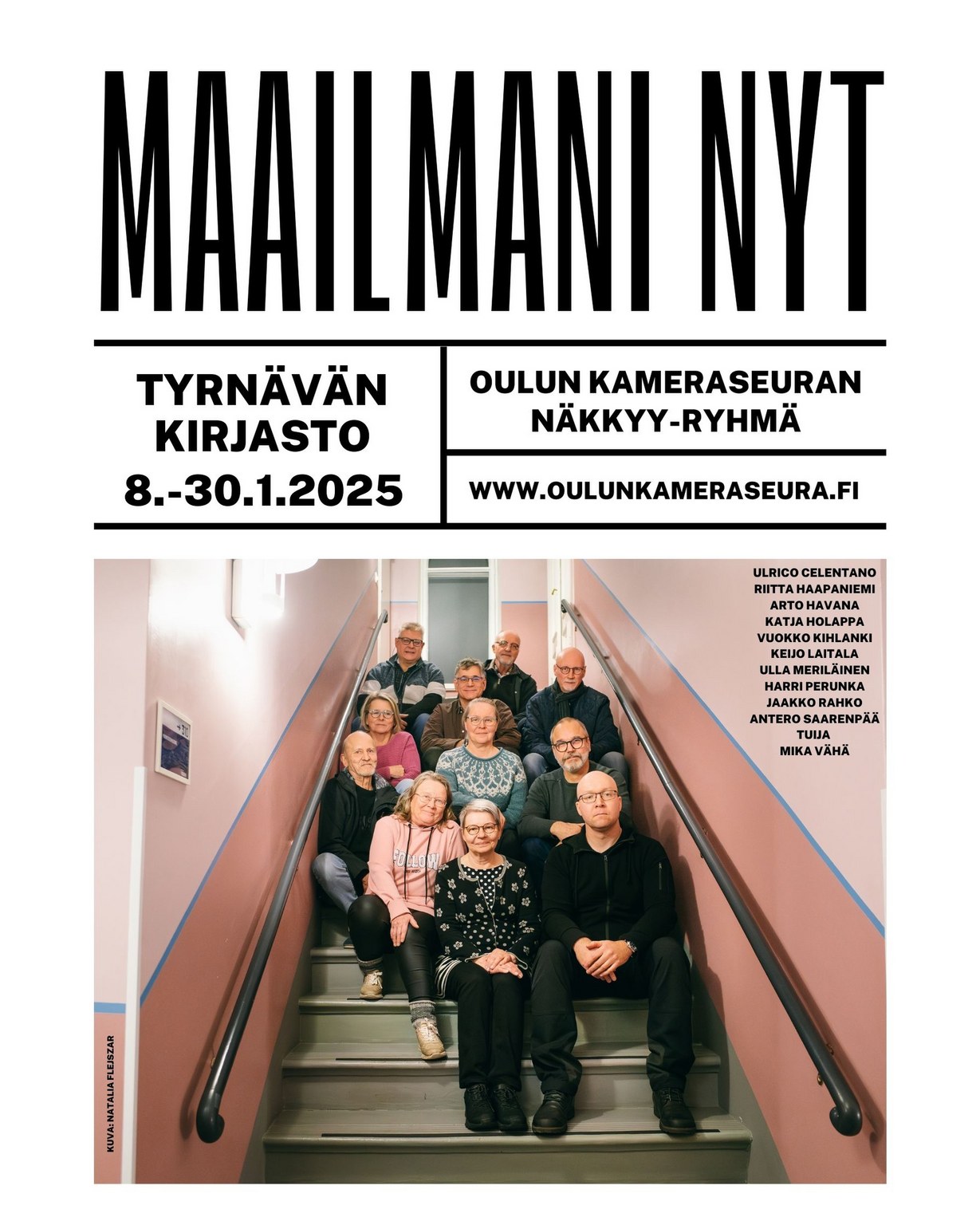 08.01.2025 12:00 - 30.01.2025 16:00 Oulun kameraseura, NÄKKYY - ryhmä: Maailmani Nyt – valokuvateoksia 8.-30.1.2025 Oulun kameraseura, NÄKKYY - ryhmä: Maailmani Nyt – valokuvateoksia esillä Tyrnävän kunnan näyttelytilassa 8.-30.1.2025 Kaksitoista valokuvaajaa tarjoavat mahdollisuuden kurkistaa heidän elämäänsä, kokemuksiinsa ja näkemyksiinsä maailmasta valokuvataiteen keinoin. Tarjolla on taiteellisia ikkunoita monenlaisiin elämän hetkiin, maisemiin, taiteeseen, tunteisiin ja ilmaisulliseen taituruuteen. Vuoden 2024 aikana valmistuneista valokuvateoksista on jalostunut ensimmäinen NÄKKYY- ryhmän yhteisnäyttely Maailmani Nyt. Osallistujien taustat valokuvaajina vaihtelevat aktiivisesta harrastajasta ammattilaiseen, heitä on mahdollisuus tavata näyttelyn avajaisissa 7.1. klo 17.00-18.00. Tervetuloa! Oulun kameraseura, NÄKKYY - ryhmä: Mukana näyttelyssä Celentano Ulrico, Haapaniemi Riitta, Havana Arto, Holappa Katja, Kihlanki Vuokko, Laitala Keijo, Meriläinen Ulla, Perunka Harri, Rahko Jaakko, Saarenpää Antero, Tuija, Vähä Mika. Tyrnävän kunnan näyttelytila, Myllykirjasto 8.1. - 30.1.2025