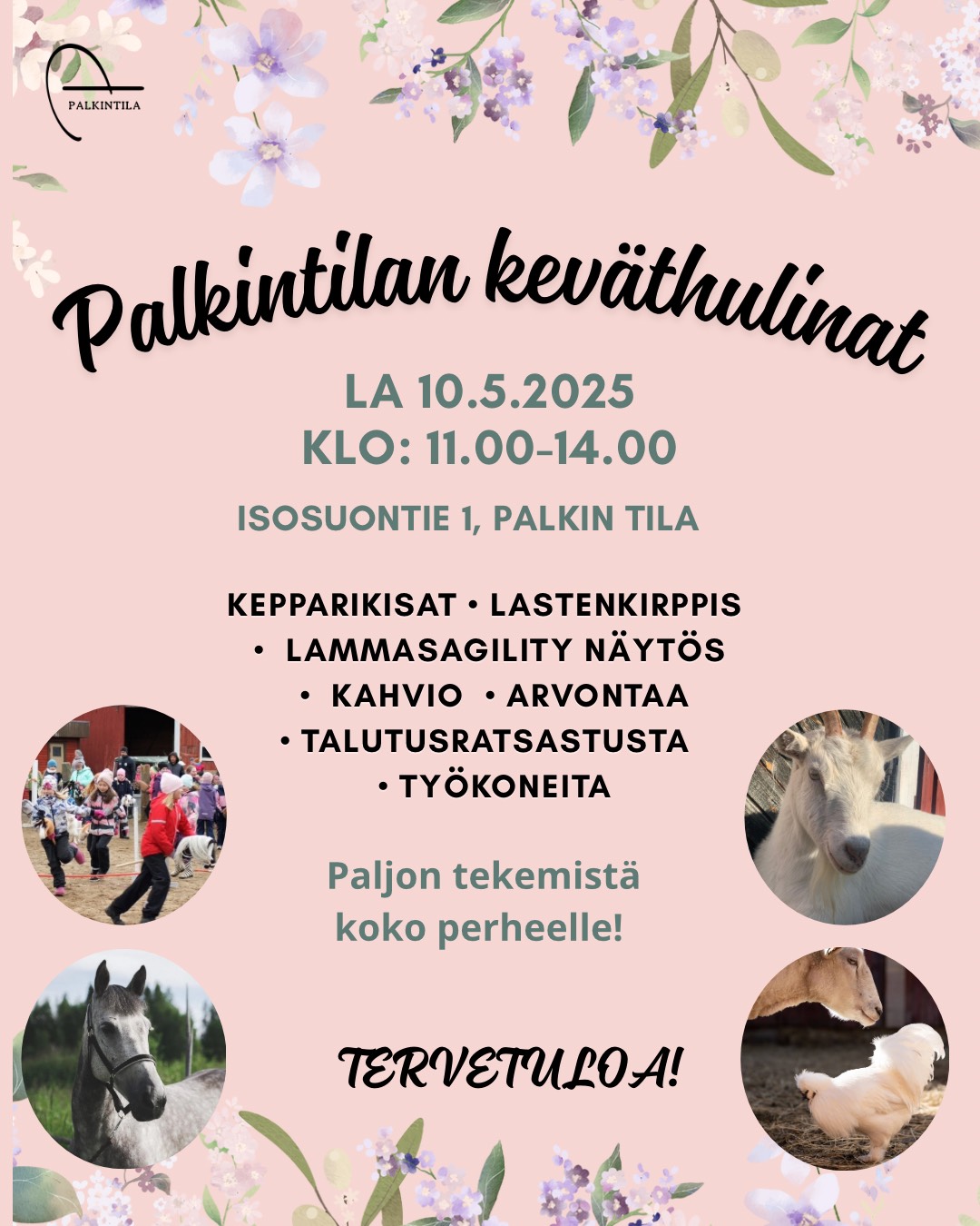 10.05.2025 11:00 - 10.05.2025 14:00 Palkin tilan Keväthulinat Palkin tilan koko perheen Keväthulinat la 10.5.2025 klo 11–14 Ohjelmassa: - kaikille avoimet kepparikisat - talutusratsastusta perheen pienimmille - paikalla traktori/muita koneita - kasvomaalauksia - arvontaa - Palkin kahvio palvelee - tilan eläimiin tutustumista ja paijailua - pihakirppis Kepparikisoihin voit ilmoittautua ennakkoon sähköpostilla laura@palkintila.fi sekä paikan päällä klo 10.30 alkaen. Meiltä saat lainata keppihevosta ja opastamme kilpailussa vasta-alkajia. Perheen pienimpien taitoluokassa puomeja, miniesteitä ja pujotteluja, jossa jokainen saa pienen palkinnon. Muissa luokissa voittaja palkitaan pokaalilla ja muut sijoittuneet ruusukkein. Luokka 1: Taitoluokka, avoin aloitteleville kepparoijille. Kaikki palkitaan. Luokka 2: 40 cm aikaluokka, avoin alle 10-vuotiaille. Luokka 4: 50 cm – 60 cm, aikaluokka Luokka 5: 70 cm – 80 cm, aikaluokka Pihakirppiksellä pääset myymään sinulle tarpeetonta tavaraa. Varaa ilmainen myyntipaikkasi palkintila@gmail.com. Tapahtumassa säävaraus. Omien lemmikkieläinten tuonti tilalle ehdottomasti kielletty. Autojen parkkeeraus osoitteeseen Isosuontie 1 sekä Isosuontien varteen ja sään mukaan parkkipaikkoja myös pelloilla. Seuraa tapahtuman Facebook- ja Instagram-sivuilta päivityksiä tapahtumaan liittyen. Lämpimästi tervetuloa viettämään mukavaa päivää!