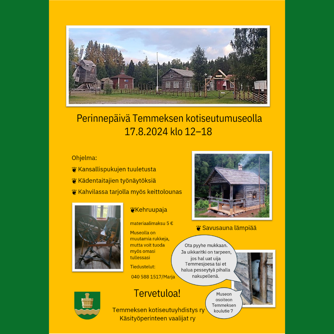 17.08.2024 12:00 - 17.08.2024 18:00 Perinnepäivä Temmeksen kotiseutumuseolla 17.8.2024 klo 12-18 Perinnepäivä Temmeksen kotiseutumuseolla 17.8.2024 klo 12-18