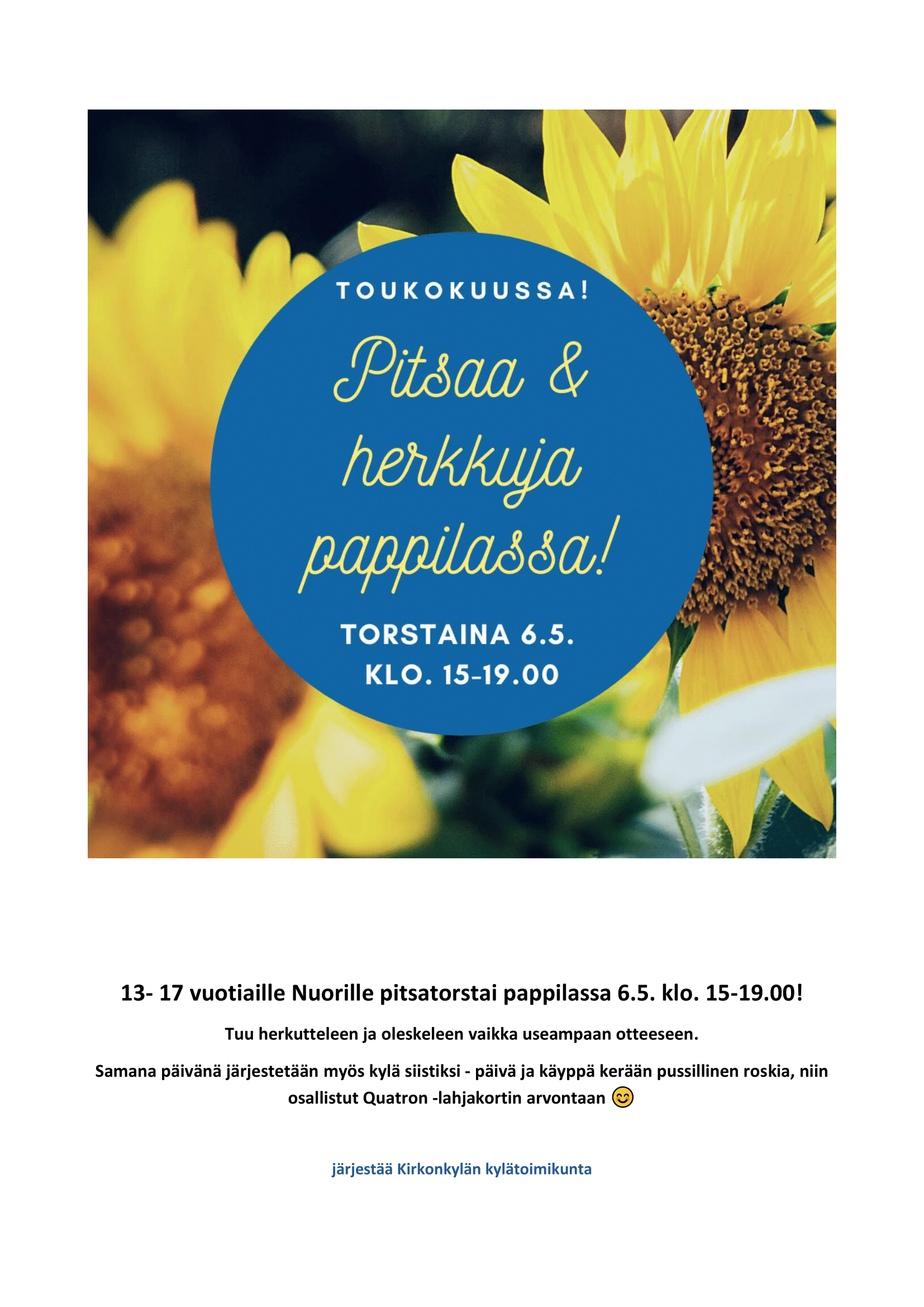 06.05.2021 15:00 - 06.05.2021 19:00 Pitsaa ja herkkuja pappilassa! Kirkonkylän kylätoimikunta tarjoaa nuorille pitsaa ja herkkuja torstaina 6.5. klo 15–19