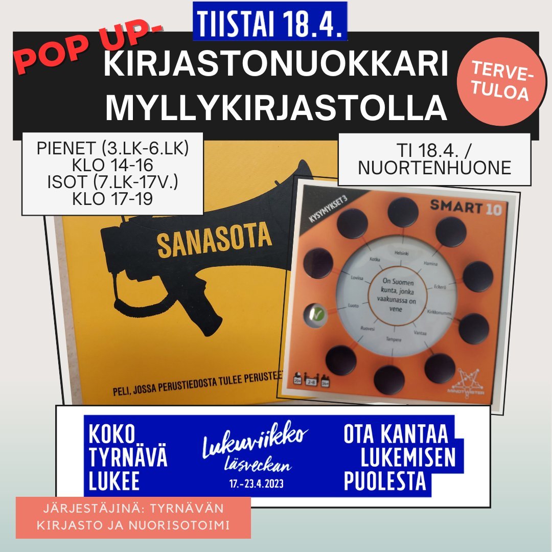 18.04.2023 14:00 - 18.04.2023 19:00 Pop up -kirjastonuokkarit Pop up -kirjastonuokkarit jälleen tiistaina 18.4.2023 Myllykirjastossa nuortenhuoneessa. 3.–6. lk. klo 14–16 7. lk. – 17 v. klo 17–19 Tervetuloa! Järjestäjinä: Tyrnävän kirjasto ja nuorisotoimi