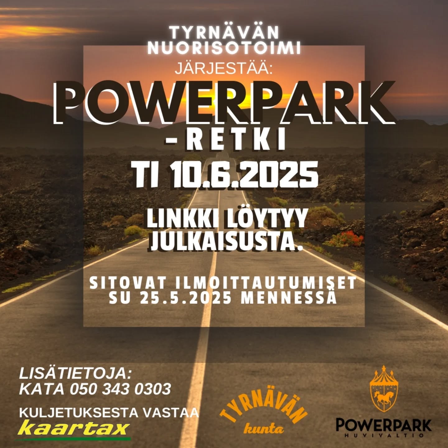 10.06.2025 08:00 - 10.06.2025 21:00 PowerPark-retki HUOM! Retki on täyttynyt! Tyrnävän nuorisotoimi järjestää: POWERPARK-RETKI TIISTAINA 10.6.2025 Lähtö Tyrnävän S-marketilta klo 7.00 Paluumatka starttaa PowerParkista noin klo 17.00, perillä Tyrnävällä noin klo 21.00. Retken hinta: 55 € (sis. MAXI-ranneke, yli 130 cm) 45 € (sis. MINI-ranneke, alle 130 cm) 20 € (sisäänpääsymaksu aikuisille PowerParkiin – ei pääsyä laitteisiin) 12 € (pelkkä kyyti, tässä tapauksessa ranneke/lippu hankittava itse) Hinnat sisältävät kuljetuksen, päivärannekkeen/sisäänpääsylipun sekä tapaturmavakuutuksen. Ruokailut hoidetaan omakustanteisesti. Alle 10-vuotiaat lapset vain huoltajan kanssa! Ilmoitathan jokaisen retkelle lähtevän henkilön erikseen (koskee myös retkelle lähteviä huoltajia). Ilmoittautumisaika on 8.–25.5.2025. ILMOITTAUTUMINEN AUKEAA TORSTAINA 8.5. KLO 18.00 ja sulkeutuu su 25.5. klo 23.59. Paikkoja on tarjolla rajoitetusti! Minimiosallistujamäärä on 30 henkilöä. https://link.webropolsurveys.com/EP/E68C83FA2766ADEC Nuorisotoimen kaikki toiminnot ovat aina päihteettömiä (koskee myös energiajuomia). Retken perumiskäytäntö: Sitovat ilmoittautumiset tehdään ilmoitettuun päivämäärään mennessä. Tämän ilmoittautumispäivämäärän jälkeen tehdyistä peruutuksista peritään 50% retken hinnasta, mikäli osallistujalla ei ole esittää lääkärintodistusta. Peruminen ilmoittautumispäivämäärän jälkeen on mahdollista ilman maksuja ainoastaan lääkärintodistusta vastaan. Kuljetuksista huolehtii Kaartax.