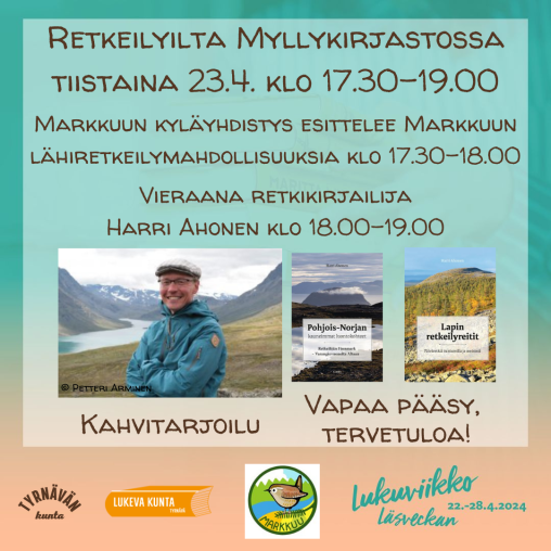 23.04.2024 17:30 - 23.04.2024 19:00 Retkeilyilta Myllykirjastossa Retkeilyilta Myllykirjastossa tiistaina 23.4. klo 17:30-19:00. Markkuun kyläyhdistys esittelee Markkuun retkeilymahdollisuuksia klo 17:30-18.00. Illan vieraana klo 18-19 on retkikirjailija Harri Ahonen, joka on kirjoittanut useita retkikirjoja. Kahvitarjoilu. Vapaa pääsy, tervetuloa! Kirjailijan tuotantoon voit tutustua täältä. Kirjoja on lainattavissa kirjastossa.