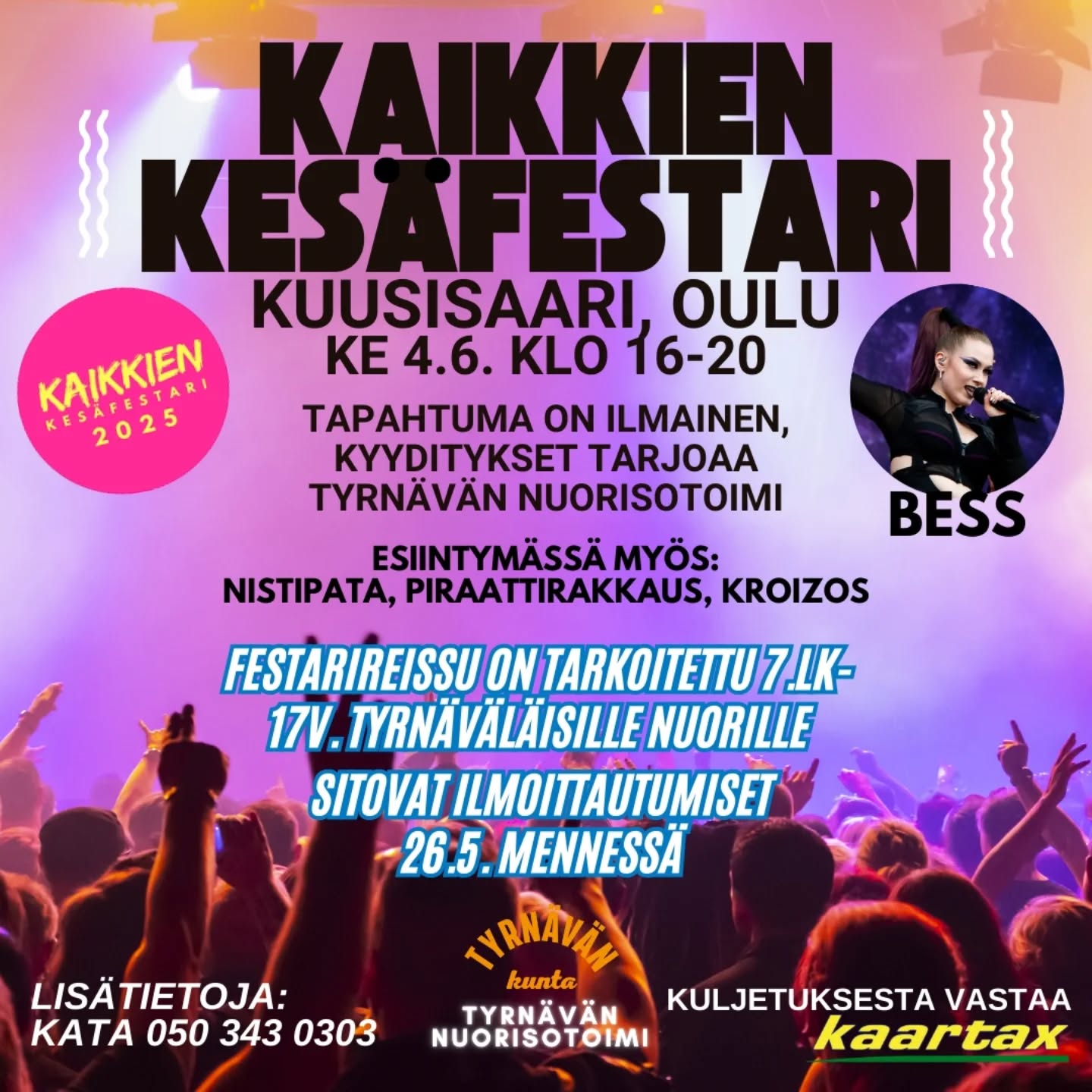 04.06.2025 00:00 - 04.06.2025 23:59 Retki Kaikkien Kesäfestareille Huom! Ilmoittautuminen on päättynyt! KAIKKIEN KESÄFESTARIT 2025 Tyrnävän nuorisotoimi tarjoaa reissun Kaikkien Kesäfestarille keskiviikkona 4.6.2025 Oulun Kuusisaareen. Mukaan otetaan tyrnäväläisiä 7.lk-17v. nuoria. Reissu on maksuton. Tämän vuoden esiintyjiä ovat: BESS NISTIPATA PIRAATTIRAKKAUS KROIZOS Ilmoittautuminen alla olevasta osoitteesta (kopioi linkki selaimeen): https://link.webropolsurveys.com/EP/6061C16919171A4C Huomioithan, että ilmoittautumiseen tarvitsee myös huoltajan luvan ja tiedot. Sitovat ilmoittautumiset 26.5. mennessä. Lähtö 4.6. klo 15.00 Tyrnävän S-marketilta. Oulusta lähtee paluukyyti klo 20.30. ja perillä Tyrnävällä S-marketilla ollaan noin klo 21.00.
