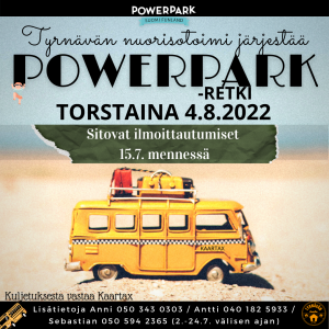 04.08.2022 07:00 - 04.08.2022 22:00 Retki PowerParkiin 4.8.2022 Tyrnävän kunnan nuorisotoimi järjestää retken PowerParkiin torstaina 4.8.2022. Retken hinta: 55 € (sis. MAXI-ranneke, yli 130 cm) 45 € (sis. MINI-ranneke, alle 130 cm) 20 € (sis. pelkkä kyyti ja sisäänpääsymaksu PowerParkiin – ei pääsyä laitteisiin) Hinnat sisältävät kuljetuksen, päivärannekkeen/sisäänpääsylipun sekä tapaturmavakuutuksen. Ruokailut hoidetaan omakustanteisesti. Alle 10-vuotiaat lapset vain huoltajan kanssa! Ilmoitathan jokaisen retkelle lähtevän henkilön erikseen (koskee myös retkelle lähteviä huoltajia). Ilmoittautumisaika on 17.6.–15.7.2022. Paikkoja on tarjolla vain rajoitetusti! Minimi osallistujamäärä: 30 henkilöä. Lisätietoja sekä ilmoittautumislomakkeen löydät osoitteesta: tyrnava.fi/powerpark2022 Retken yhteyshenkilöt: Anni Hemmilä (Lomalla 4.7.–24.7.) Vastaava nuoriso-ohjaaja p. 050 343 0303 anni.hemmila@tyrnava.fi Antti Kumpulainen (Lomalla 4.7.–24.7.) Nuoriso-ohjaaja p. 040 182 5933 antti.kumpulainen@tyrnava.fi Sebastian Savolainen Etsivä nuorisotyöntekijä p. 050 594 2365 sebastian.savolainen@tyrnava.fi
