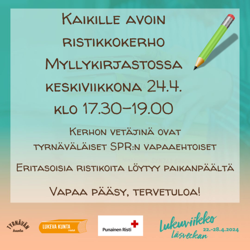 24.04.2024 17:30 - 24.04.2024 19:00 Ristikkokerho Myllykirjastossa Kaikille avoin ristikkokerho Myllykirjastossa keskiviikkona 24.4. kello 17:30-19:00. Kerhon vetäjinä toimivat tyrnäväläiset SPR:n vapaaehtoiset. Eritasoisia ristikoita löytyy paikanpäältä. Vapaa pääsy, tervetuloa!