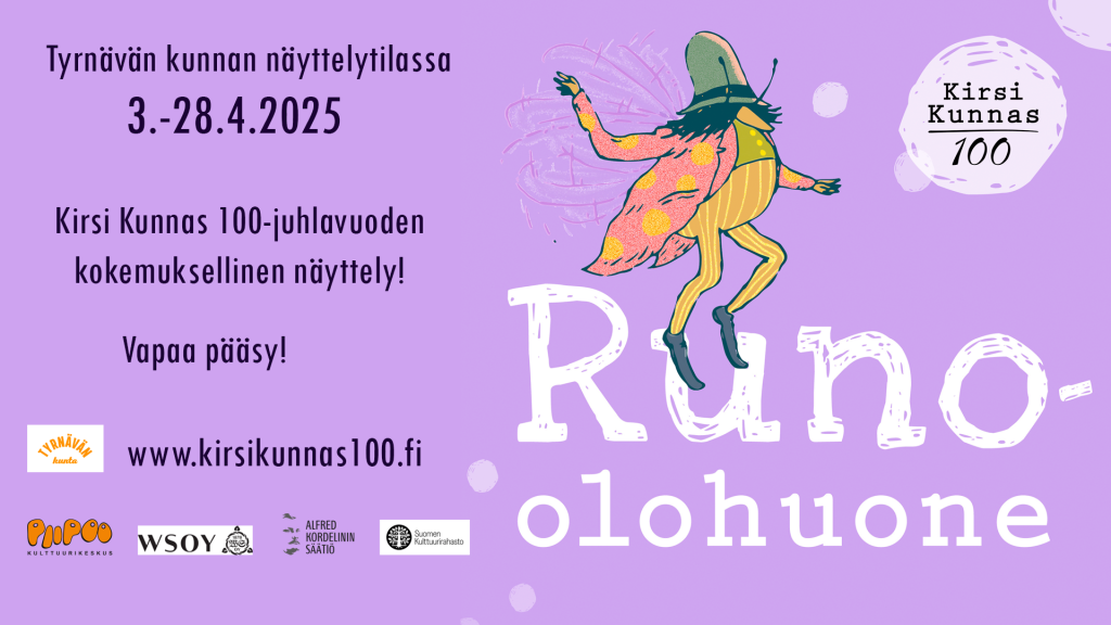 03.04.2025 09:00 - 28.04.2025 19:00 Runo-olohuone: Kirsi Kunnas 100 vuotta! Näyttely 3.–28.4.2025 Runo-olohuone: Kirsi Kunnas 100 vuotta! Näyttely esillä Tyrnävän kunnan näyttelytilassa 3.–28.4.2025 Kirsi Kunnas 100 -juhlavuoden näyttely pohjautuu Kunnaksen rakastettuihin lastenrunoihin sekä Jani Ikosen kuvituksiin WSOY:n runoantologiasta Haitulan Taikahattu (2024). Runo-olohuone on osa Kulttuurikeskus PiiPoon koordinoimaa juhlavuoden Lasten runovallankumous -hanketta. Runo-olohuone-näyttely toteutetaan lastenkulttuurikeskuksissa, kirjastoissa, koululuokissa, päiväkodeissa ja kulttuuritiloissa ympäri Suomen vuosina 2024–25. Toteutukset eri puolilla Suomea pohjautuvat Kulttuurikeskus PiiPoon tuottamaan näyttelymateriaaliin. kulttuuripiipoo.fi kirsikunnas100.fi Näyttelyyn on vapaa pääsy! HUOM! Ryhmien tulee sopia tulonsa etukäteen, jotta tila ei ruuhkaannu. Avaamme varauskalenterin viikolla 12. Kysymykset näyttelyyn liittyen: kirjasto@tyrnava.fi tai tii.veijola@tyrnava.fi