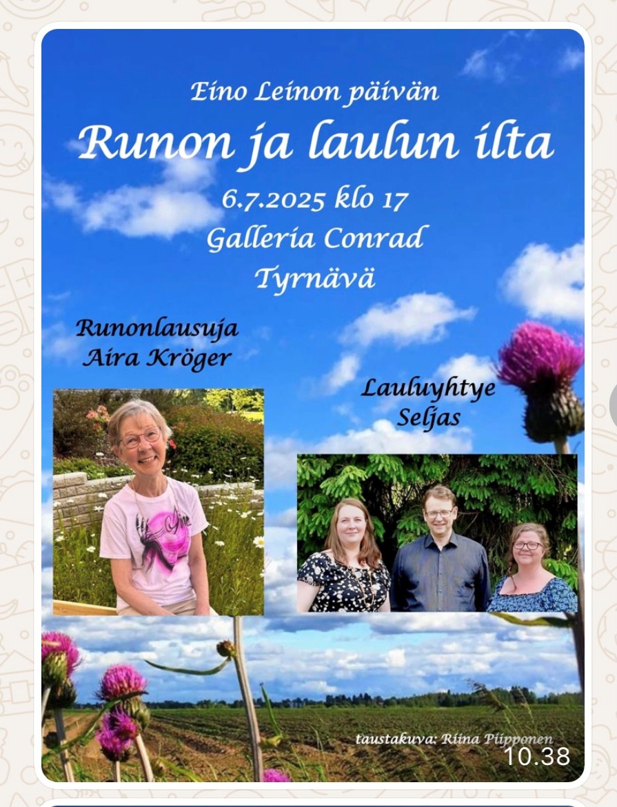 06.07.2025 17:00 - 06.07.2025 19:00 Runon ja laulun ilta Runon ja laulun illassa sunnuntaina 6.7.2025 klo 17 Café & Galleria Conradissa (Muhostie 88) esiintyvät runonlausuja Aira Kröger ja Lauluyhye Seljas (Riikka Saarela, sopraano; Henna-Leena Isokääntä, altto ja Pasi Hyrynkangas, baritoni).