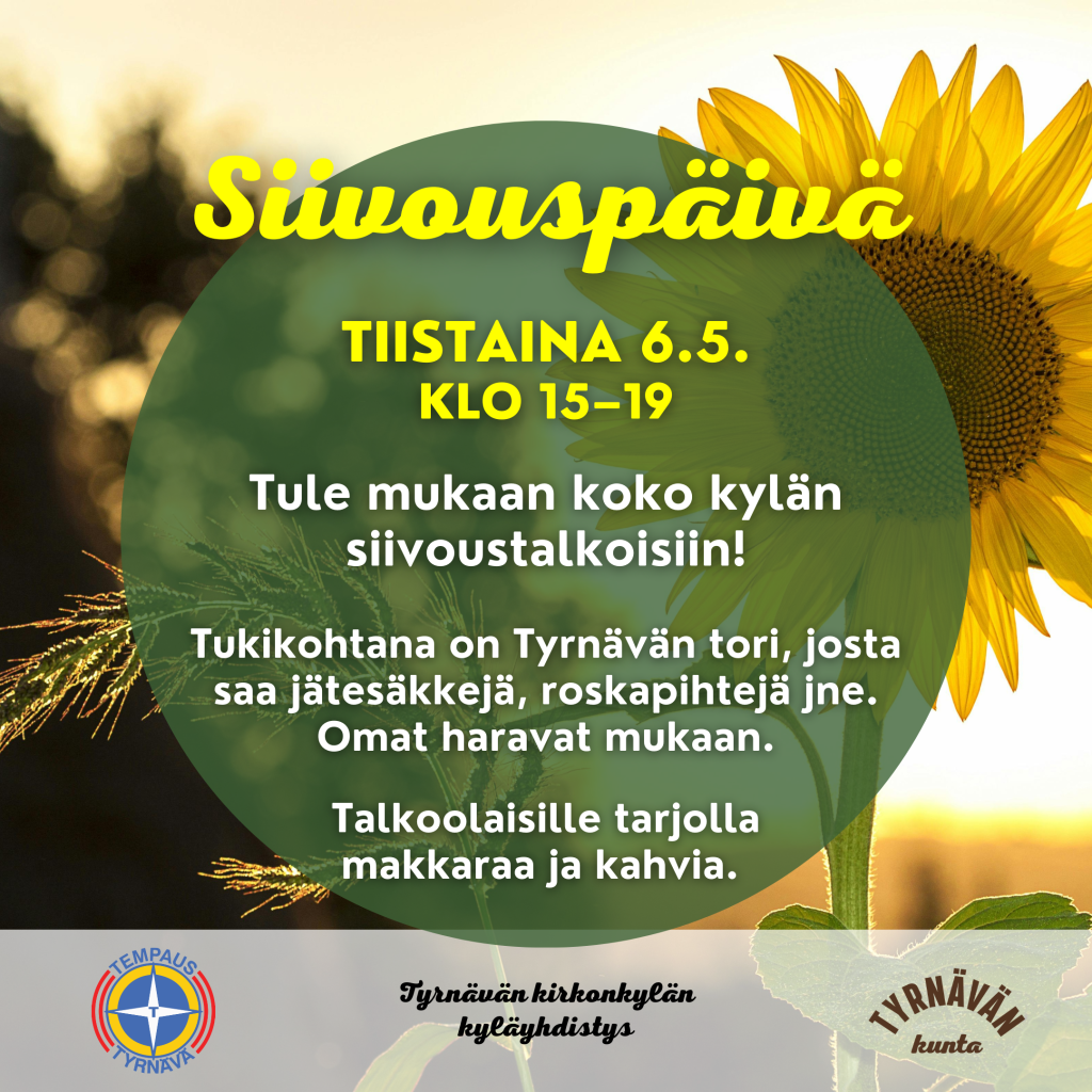 06.05.2025 15:00 - 06.05.2025 19:00 Siivouspäivä Tervetuloa mukaan koko kylän siivoustalkoisiin! Tyrnävän kirkonkylän kyläyhdistys järjestää perinteisen siivouspäivän jälleen tiistaina 6.5. klo 15–19. Tukikohtana toimii Tyrnävän tori, josta saa jätesäkkejä, roskapihtejä jne. Omat haravat mukaan. Talkoolaisille on tarjolla makkaraa ja kahvia! Voit tulla mukaan vaikka osaksi aikaa! Järjestäjät: Tyrnävän kirkonkylän kyläyhdistys, Tyrnävän kunta ja Tyrnävän Tempaus