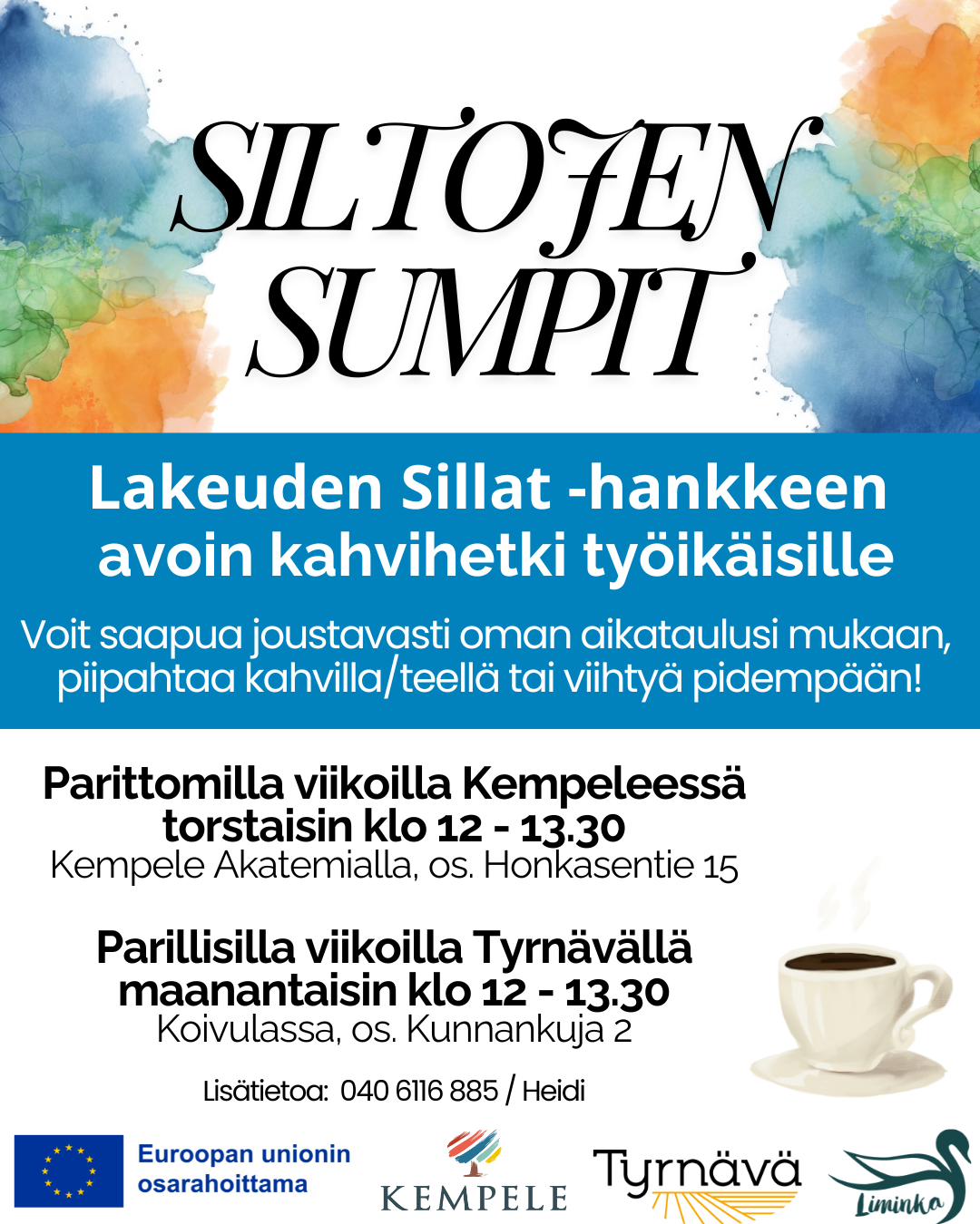 19.01.2026 12:00 - 19.01.2026 13:30 Siltojen sumpit Työikäisten kahvihetki Siltojen Sumpit laajenee Tyrnävälle 🙂 Jatkossa kahvitellaan vuoroviikoin Tyrnävällä ja Kempeleessä; Tyrnävällä parillisten viikkojen maanantaisin klo 12–13.30 ja Kempeleessä parittomien viikkojen torstaisin klo 12–13.30. Molempiin ovat tervetulleita työikäiset kaikista hankekunnista. Ei tarvitse ilmoittautua ennakkoon ja viipyä voi sen aikaa kuin kulloinkin omiin aikatauluihin passaa.