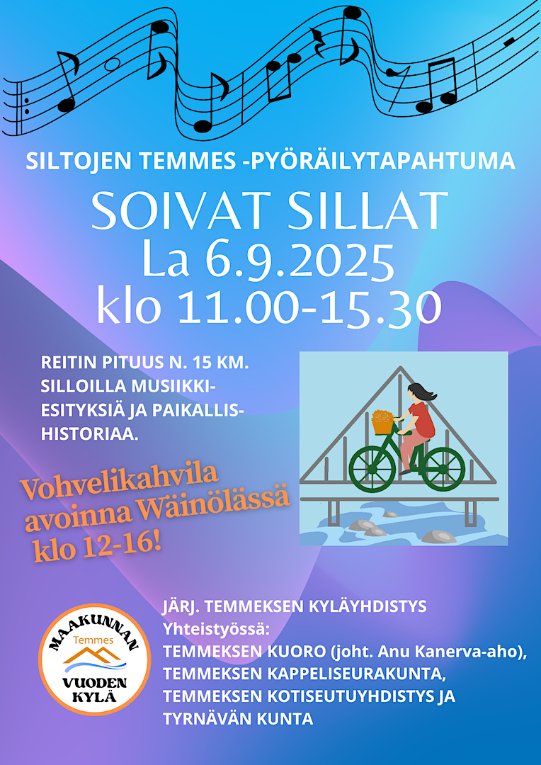 06.09.2025 11:00 - 06.09.2025 15:30 Siltojen Temmes -pyöräilytapahtuma "Soivat Sillat" Siltojen Temmes -pyöräilytapahtuma "Soivat Sillat" la 6.9.2025 klo 11.00–15.30 Lähtö Mäkelän sillalta (Haurukyläntie 15) klo 11.00. Reitin pituus noin 15 kilometriä. Silloilla musiikkiesityksiä ja paikallishistoriaa. Wäinölässä: Vohvelikahvila klo 12–16! Tyrnävän Sydänyhdistyksen piste klo 13–16! Tervetuloa! Järjestäjä: Temmeksen kyläyhdistys Yhteistyössä: Temmeksen kuoro (joht. Anu Kanerva-aho), Temmeksen kappeliseurakunta, Temmeksen kotiseutuyhdistys ja Tyrnävän kunta SILTOJEN TEMMES -PYÖRÄILYTAPAHTUMAN OHJELMA JA REITTI: ”He heittivät lantin joenpyörteeseen ja nimensä raaputtivat sillan kaiteeseen…” (Katariina Honkanen Silta laulu.) LÄHTÖ: Mäkelän silta (Haurukyläntie 15) klo 11:00 - pyöräilyn teemat ja turvallisuusohjeet - Temmeksen kuoron musiikkiesitys (joht. Anu Kanerva-aho) - pyöräily klo 11:20–11:30 Haurukyläntietä kohti Mikkolan Myllyä ja siltaa 2. Mikkolan Mylly ja silta klo 11:30 - lyhyt esittely - pyöräily klo 11:40–12:00 Haurukyläntie, Tomperintie ja Vikiönkoskentie kohti joenrantaa 3. Vikiön silta klo 12:00–12:20 (sillan osoite Vikiönkoskentie tai Lännentie 39) - lyhyt esittely - Temmeksen kuoron musiikkiesitys - pyöräily klo 12:20–12:40 Lännentietä pitkin kohti Heinijärventietä ja Perttulan siltaa 4. Perttulan silta klo 12:40 - lyhyt esittely - pyöräily klo 12:45–12:50 Heinijärventietä pitkin Temmeksen kirkkotielle 5. Temmeksen kirkko klo 12:50-13:15 - Temmeksen kuoron musiikkiesitys - Paikallisopas Briitta: kirkon esittely ja kirkonmäen tarinat - klo 13:15–13:25 pyöräily Temmeksen kirkkotietä pitkin jatkaen pyörätielle ja kylätalo Wäinölään. Haapaniemen silta on Haapasepäntien varressa, voi käydä katsomassa. 6. Kylätalo Wäinölä klo 13:25–14:00 - lauluesitys Juhani Marttila - vohvelikahvila - pyöräily kohti Meijerinkylää ja Hongan siltaa klo 14:00–14:10 7. Hongan silta klo 14:10–14:15 - P. Mustapään runo Leppäkerttu - pyöräily klo 14:15–14:30 Temmeksentie, Temmeksen koulutie 8. Temmeksen museoalue klo 14:30–15:30 - Temmeksen kuoro, joht. Anu Kanerva-aho Huom! Pyöräilijät omalla vastuulla. Toivotaan pyöräilykypärää sekä turvaliiviä. Pyöräilijöitä ohjaa johtoauto sekä perässä ajaa turva-auto/mönkkäri. Tapahtumaan voit tutustua myös tulemalla suoraan toimintapisteisiin. Ilmoittautuminen ei ole pakollista mutta toivomme, että kerrot turvahenkilöille jos pyöräilet vain osan matkaa. Huom! Wäinölän vohvelikahvila avoinna klo 12–16 Huom! Tyrnävän Sydänyhdistyksen piste Wäinölässä klo 13–16 Lisätietoja, puh. 040 531 5031 / Briitta Honka-Tuuri