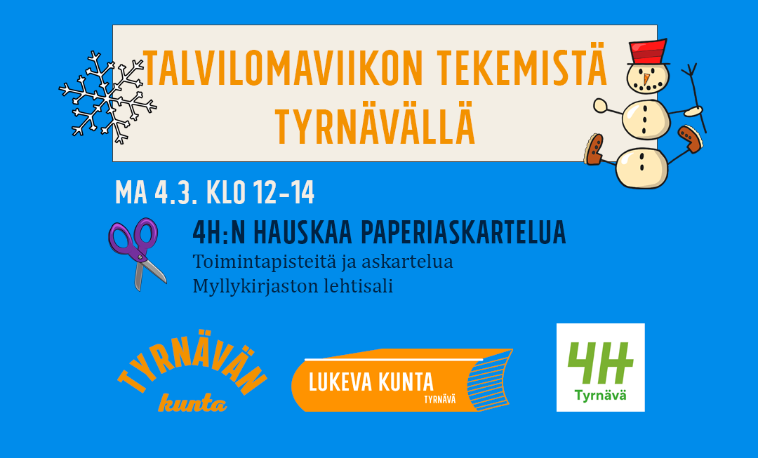 04.03.2024 12:00 - 04.03.2024 14:00 Talvilomaviikon tekemistä lapsille: 4H:n hauskaa paperiaskartelua ma 4.3. klo 12-14 Myllykirjastossa
