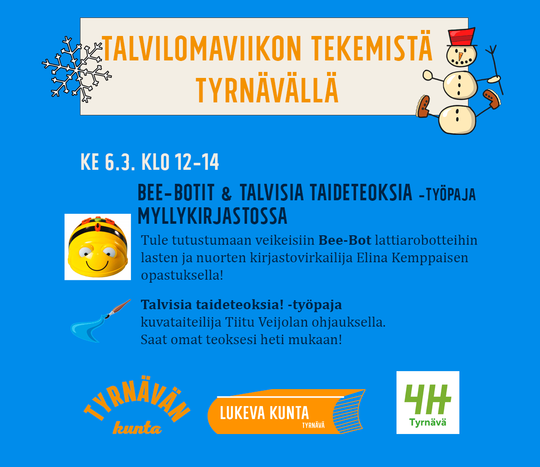 06.03.2024 12:00 - 06.03.2024 14:00 Talvilomaviikon tekemistä lapsille: Bee-Botit ja Talvisia taideteoksia! -työpaja ke 6.3. klo 12-14 Myllykirjastossa