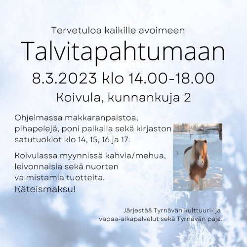 08.03.2023 14:00 - 08.03.2023 18:00 Talvitapahtuma Kaikille avoin talvitapahtuma Koivulassa ke 8.3.2023 klo 14.00–18.00! Talvitapahtuma ke 8.3.2023 klo 14.00–18.00 Koivulassa (Kunnankuja 2, 91800 Tyrnävä). Ohjelmassa muun muassa pihapelejä, poni paikalla sekä Tyrnävän kirjaston satutuokiot klo 14.00, 15.00, 16.00 ja 17.00. Tyrnävän nuoriso-ohjaajat tarjoavat lapsille ja nuorille paikan päällä makkaraa sekä lämmintä juotavaa! Tyrnävän paja myy Koivulassa tapahtuman yhteydessä kahvia, mehua, leivonnaisia ja nuorten valmistamia tuotteita! Käteismaksu! Tervetuloa! Järjestäjänä: Tyrnävän kulttuuri- ja vapaa-aikapalvelut & Tyrnävän paja