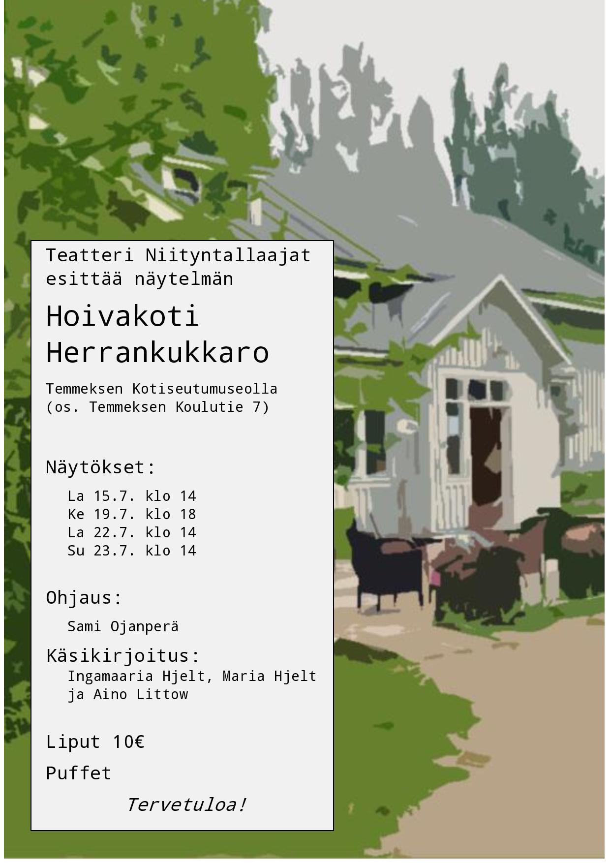 19.07.2023 18:00 - 19.07.2023 20:00 Teatteri Niityntallaajat esittää näytelmän: Hoivakoti Herrankukkaro Teatteri Niityntallaajat esittää näytelmän: Hoivakoti Herrankukkaro Temmeksen Kotiseutumuseolla