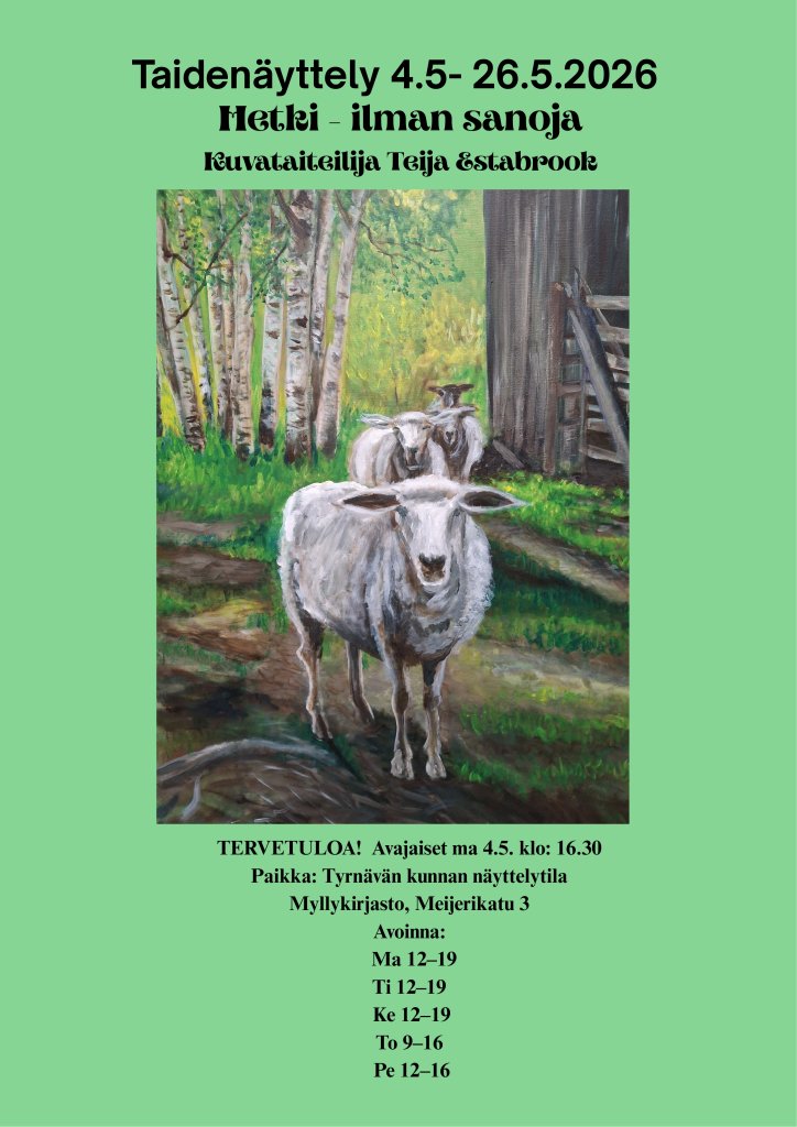 04.05.2026 12:00 - 26.05.2026 19:00 Teija Estabrookin taidenäyttely Hetki – Ilman sanoja 4.-26.5.2026 Teija Estabrookin taidenäyttely Tyrnävän kunnan näyttelytilassa Myllykirjastossa toukokuussa 2026. Teija Estabrookin taidenäyttely Hetki – Ilman sanoja 4.-26.5.2026 Usein kuulee sanottavan : “Yksi kuva kertoo tuhat sanaa”. Näyttelyn teemana on elämän hetket ja kokemukset, joita on tulkittu värien ja erilaisten luonnon aiheiden avulla. Hetki ilman sanoja näyttely kutsuu katsojia antamaan anonyymisti sanoja teoksille. Sanoista muodostetaan runoja, joista syntyy myöhemmin runokirja. Tyrnävän kunnan näyttelytilan näyttelyt ovat avoinna kirjaston aukioloaikojen mukaisesti ma–ke klo 12–19, to klo 9–16 ja pe klo 12–16. Huomioittehan ystävällisesti, että omatoimiaikana näyttelytilaan ei ole pääsyä.