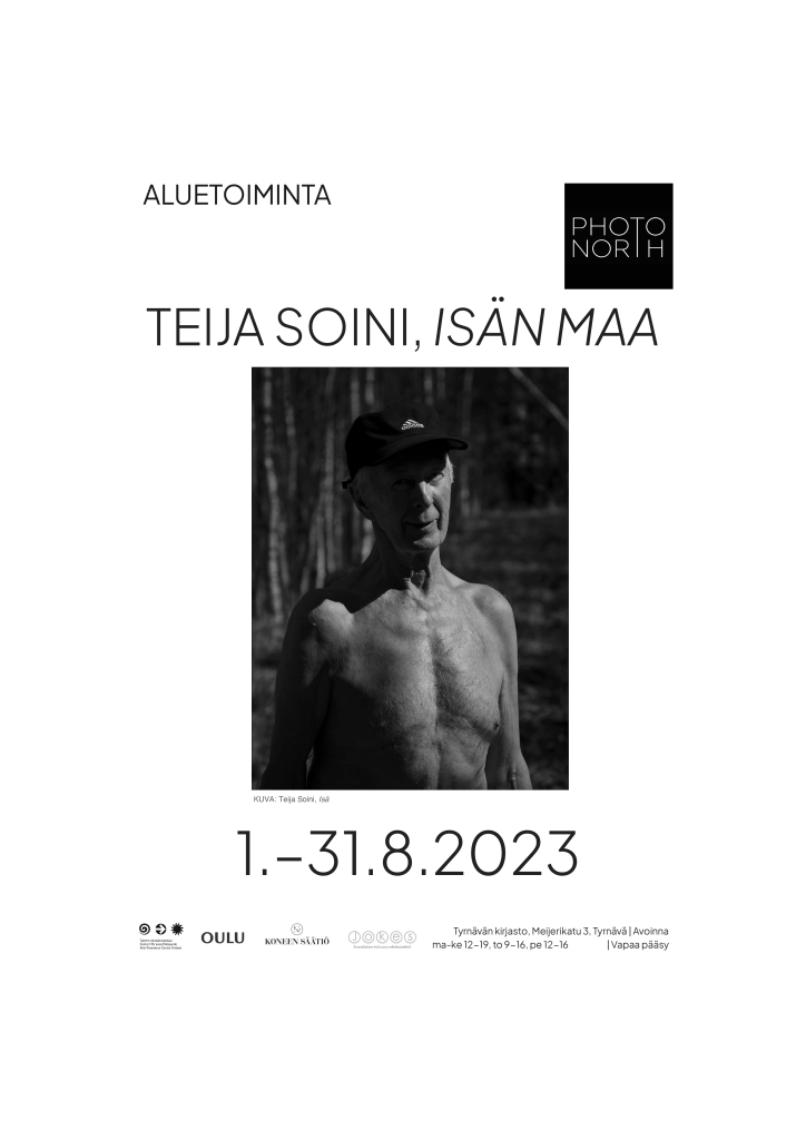 01.08.2023 12:00 - 31.08.2023 16:00 Teija Soini: Isän maa -valokuvanäyttely Teija Soini: Isän maa -valokuvanäyttely Tyrnävän kunnan näyttelytilassa 1.-31.8. Valokuvaaja Teija Soini on kuvannut Isän maa kokonaisuudessa isäänsä, tämän lapsuuden kotipaikkaa sekä omaa mielimaisemaansa. Teoskokonaisuudessa taiteilija pohtii miten lapsuuden maisema ja synnyinseutu kulkee mukanamme läpi elämän. Näyttelyn kuvat on otettu Tupoksessa ja lähiseudulla vuosina 2022-23. Nämä tasaiset maat ovat entistä merenpohjaa ja maisema muuttuu yhä. Vaikka kotimaiseman aavat pellot kasvavat nyt koivua ja monet rakennukset on purettu, paikan hengen voi vielä aistia. Taiteilija on asunut useissa maissa ja matkustellut paljon ympäri maailmaa. Silti hänen mukanaan on kulkenut aina lakeuden tunne ja lakeus on pysynyt hänen sielunmaisemanaan. Tyrnävän kirjastolla nähdään 18 teosta jotka on kuvattu suurimmaksi osaksi filmille. Isän maa -näyttely on osa suurempaa, pitkäkestoista lakeuden olemusta tarkastelevaa valokuvausprojektia, jossa Soini käsittelee myös ihmisen kiintymystä paikkaan ja maisemaan. Teija Soini (s.1967) on Oulussa asuva ja työskentelevä valokuvaaja. Hän inspiroitui valokuvaamisesta 90-luvulla asuessaan Teksasissa. Hän opiskeli valokuvausta tuolloin North Lake Collegessa, Dallasissa ja kuvasi dokumentaarista valokuvaa elämästä Teksasissa ja Usa:ssa. Kuvaaminen jatkui aktiivisena 2000-luvun alussa viiden Italian Toscanassa asutun vuoden ajan. Vuonna 2007 Soini palasi Suomeen ja löysi oman paikkansa Oulun seudulta. Hän on suorittanut Suomessa valokuvaajan erikoisammattitutkinnon ja kuvaa freelancevalokuvaajana useille suomalaisille aikakauslehdille, yrityksille ja sanomalehdille. Pohjoinen luonto, ihmiset ja ilmiöt inspiroivat Soinin kuvia. Hänen valokuvaprojektinsa käsittelevät usein luontoa ja ihmisen luontoyhteyttä. Vuonna 2020 hän julkaisi valokuvakirjan N65°37′32″E27°36′16″, joka kertoo Syötteen alueella nähdyistä tunnistamattomista valoilmiöistä, alueen ihmisistä ja heidän luontosuhteestaan sekä muista yliluonnollisista kohtaamisista. Kirjan julkaisi arvostettu Raw View Editions. Hankkeen kuvia on ollut esillä myös useissa näyttelyissä. Vuonna 2021 Soini kuvasi valokuvakokonaisuuden kirjailija Jenni Räinän luonnossa liikkuvista naisista kertovaan Kulkijat -teokseen. Avoinna ma-ke 12-19 to 9-16 pe 12-16 www.fotosoini.com