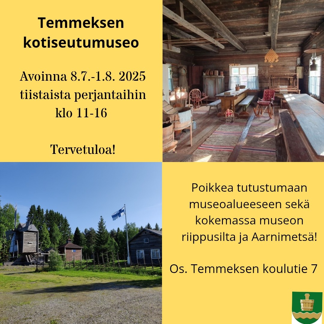 08.07.2025 11:00 - 01.08.2025 16:00 Temmeksen kotiseutumuseo avoinna 8.7.–1.8.2025 ti–pe klo 11–16 Temmeksen kotiseutumuseo on avoinna 8.7.–1.8.2025 tiistaista perjantaihin klo 11–16. Poikkea tutustumaan museoalueeseen sekä kokemassa museon riippusilta ja Aarnimetsän luontopolut. Vapaa pääsy, tervetuloa!