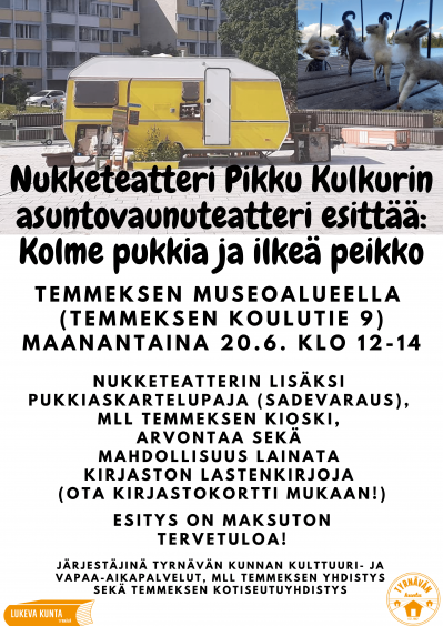 20.06.2022 12:00 - 20.06.2022 14:00 Temmeksen museoalueella: Nukketeatteri Pikku Kulkurin asuntovaunuteatteri esittää: Kolme pukkia ja ilkeä peikko Nukketeatteri Pikku Kulkurin asuntovaunuteatteri Temmeksen museoalueella maanantaina 20.6. klo 12–14. Asuntovaunuteatterissa esitetään näytelmää Kolme pukkia ja ilkeä peikko non-stoppina kahden tunnin ajan. Asuntovaunussa on pienoiskatsomo noin kymmenelle hengelle kerrallaan. Asuntovaunun edustalla on pukkipaja, jossa lapset voivat omaa vuoroaan odotellessaan askarrella oman pukin (sadevaraus, pieni sade ei haittaa, mutta kaatosateen sattuessa pukkipajaa ei järjestetä). Tapahtumassa on lisäksi MLL Temmeksen yhdistyksen kioski sekä mahdollisuus lainata kirjaston lastenkirjoja (ota kirjastokortti mukaan!). Arvomme kaikkien kävijöiden kesken kirjapalkinnon. Esitys on maksuton, tervetuloa! Järjestäjinä Tyrnävän kunnan kulttuuri- ja vapaa-aikapalvelut, MLL Temmeksen yhdistys sekä Temmeksen kotiseutuyhdistys.