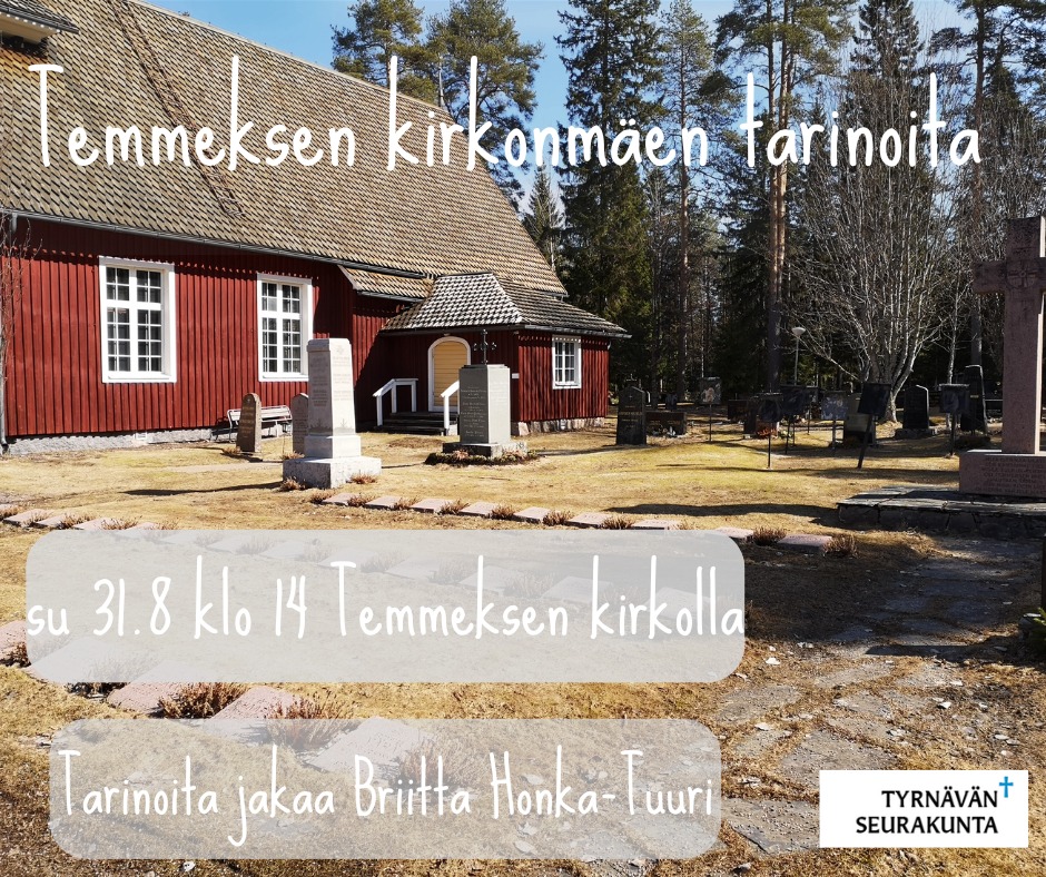 31.08.2025 14:00 - 31.08.2025 16:00 Temmeksen tuhannet tarinat Tule kuulemaan Temmeksen kirkonmäen tarinoita sunnuntaina 31.8. klo 14 Temmeksen kirkkoon! Keitä olivat Antti L., Konstantin H., Hermanni M. ja Kaarlo H.? Mitä Sara Wacklin ja Kaisa Kyläkoski kertoivat kuninkaallisten vierailusta Temmeksen kirkossa 1802? Tykkejä kirkonmäellä Suomen sodan aikaan? Miten Suomen itsenäisyysjulistus liittyy Temmeksen kirkkomaahan? Ja lukuisa määrä muita mielenkiintoisia tarinoita Temmeksen kirkosta selviää Briitta Honka-Tuurin kertomana. Kahvitarjoilu. Lämpimästi tervetuloa!