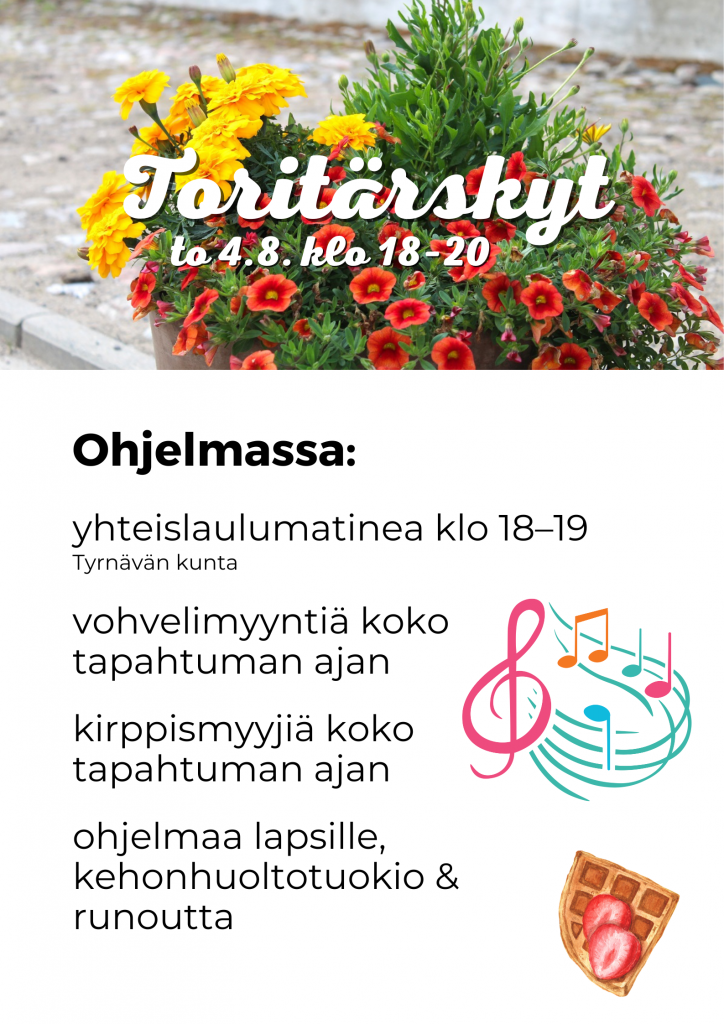 04.08.2022 18:00 - 04.08.2022 20:00 Toritärskyt Toritärskyt torstaina 4.8.2022 klo 18–20 Tyrnävän torilla! Tule nauttimaan toritunnelmasta elokuiseen iltaan! Tyrnävän kunnan järjestämässä yhteislaulumatineassa klo 18–19 lauletaan ikivihreitä sävelmiä Jari Puhakan säestyksellä. 🎵 Tyrnävän kotiseutu- ja museoyhdistys ja kirkonkylän kyläyhdistys myyvät vohveleita koko tapahtuman ajan. Varaa siis käteistä mukaan, jos makeanhimo sattuu yllättämään! 😋 Illassa mahdollisuus myös kirppistelyyn! Tule myymään ylimääräiset tavarat pois ja tekemään upeita löytöjä! Omat pöydät, ei ennakkoilmoittautumista tai paikkamaksua! Luvassa lisäksi pientä kisailua ja ohjelmaa lapsille, kehonhuoltotuokio ja runoutta! 🌺 Tapahtuman järjestää Tyrnävän kirkonkylän kyläyhdistys