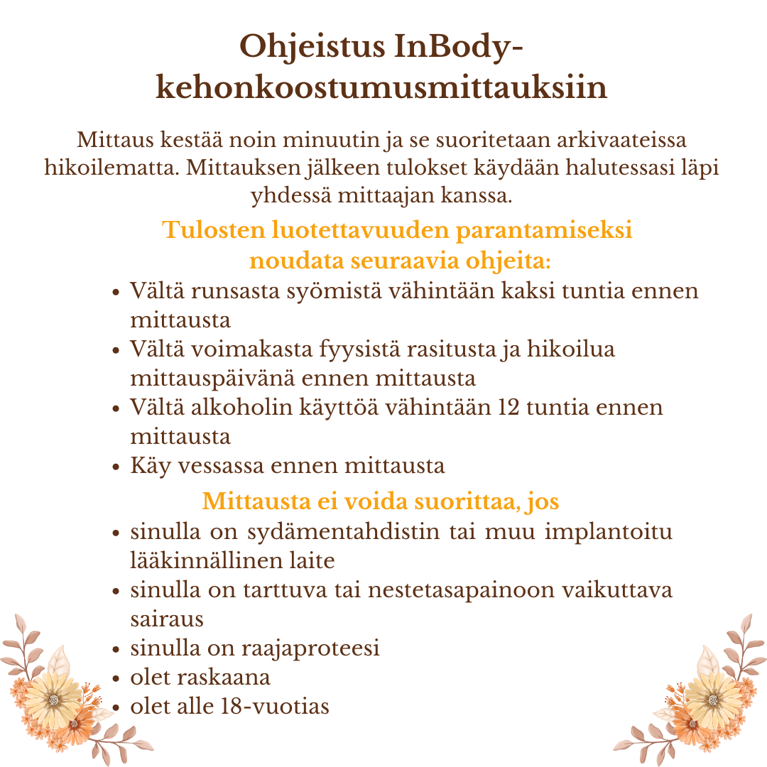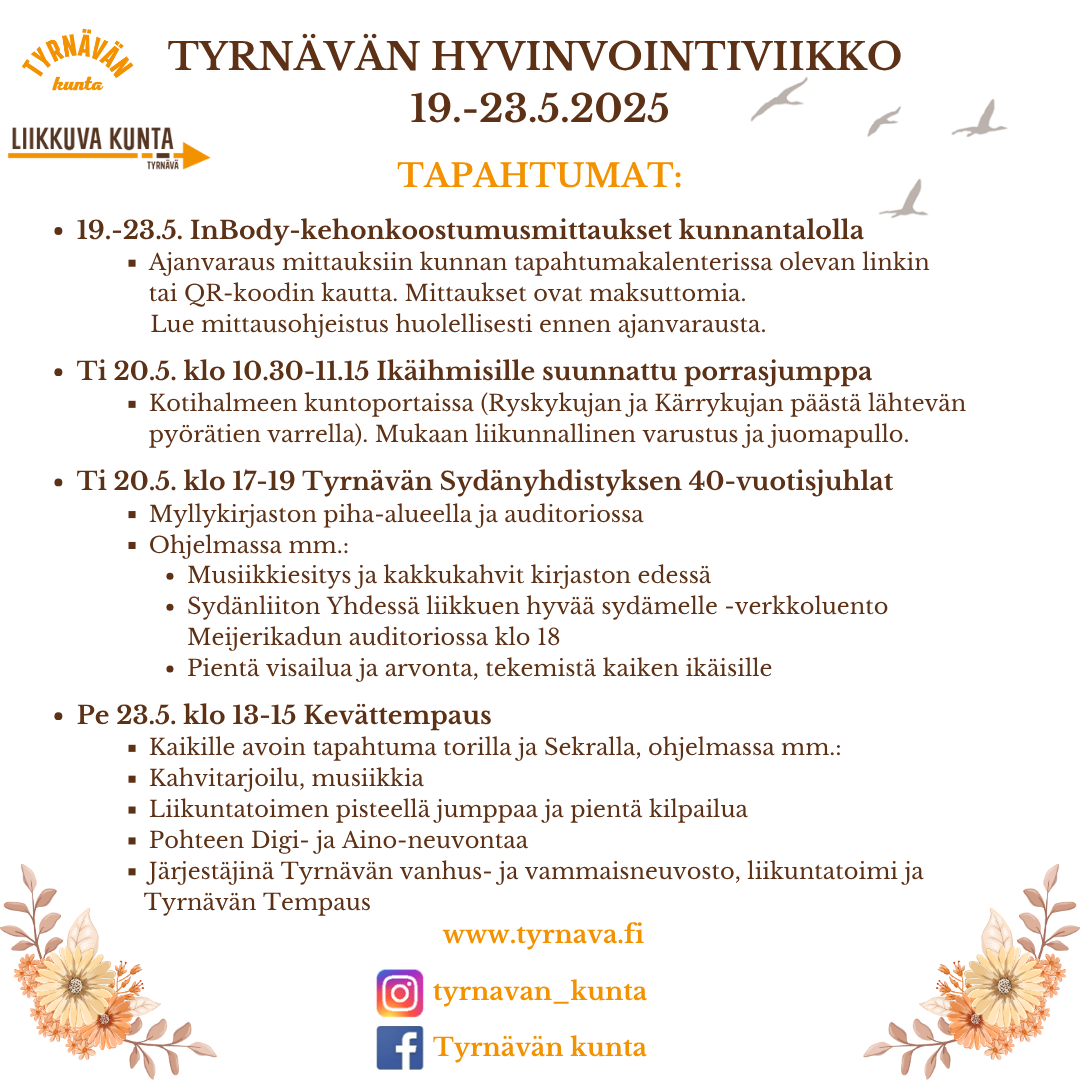 19.05.2025 00:00 - 23.05.2025 00:00 Tyrnävän hyvinvointiviikko TYRNÄVÄN HYVINVOINTIVIIKON OHJELMAA 19.–23.5.2025: 19.–23.5. InBody-kehonkoostumusmittaukset kunnantalolla Ajanvaraus mittauksiin tästä linkistä. Mittaukset ovat maksuttomia. Lue mittausohjeistus (alla) huolellisesti ennen ajanvarausta. Ti 20.5. klo 10.30–11.15 Ikäihmisille suunnattu porrasjumppa Kotihalmeen kuntoportaissa (Ryskykujan ja Kärrykujan päästä lähtevän pyörätien varrella. Mukaan liikunnallinen varustus ja juomapullo. Ti 20.5. klo 17–19 Tyrnävän Sydänyhdistyksen 40-vuotisjuhlat Myllykirjaston piha-alueella ja auditoriossa. Ohjelmassa mm. musiikkiesitys ja kakkukahvit kirjaston edessä, Sydänliiton Yhdessä hyvää sydämelle -verkkoluento Meijerikadun auditoriossa klo 18. Pientä visailua ja arvontaa, tekemistä kaikenikäisille. Pe 23.5. klo 13–15 Kevättempaus Kaikille avoin tapahtuma torilla ja Sekralla. Ohjelmassa mm. kahvitarjoilu, musiikkia, liikuntatoimen pisteellä jumppaa ja pientä kilpailua, Pohteen Digi- ja Aino -neuvontaa. Järjestäjinä Tyrnävän vanhus- ja vammaisneuvosto, liikuntatoimi ja Tyrnävän Tempaus. InBody-kehonkoostumusmittausten ajanvaraus täältä. Jos ajanvaraus ei onnistu tai et löydä sopivaa aikaa, soita liikuntakoordinaattorille: p. 040 651 2638. Ohjeistus InBody-kehonkoostumusmittauksiin Mittaus kestää noin minuutin ja se suoritetaan arkivaatteissa hikoilematta. Mittauksen jälkeen tulokset käydään halutessasi läpi yhdessä mittaajan kanssa. Tulosten luotettavuuden parantamiseksi noudata seuraavia ohjeita: Vältä runsasta syömistä vähintään kaksi tuntia ennen mittausta. Vältä voimakasta fyysistä rasitusta ja hikoilua mittauspäivänä ennen mittausta. Vältä alkoholin käyttöä vähintään 12 tuntia ennen mittausta. Käy vessassa ennen mittausta. Mittausta ei voida suorittaa, jos sinulla on sydämentahdistin tai muu implantoitu lääkinnällinen laite, sinulla on tarttuva tai nestetasapainoon vaikuttava sairaus, sinulla on raajaproteesi, olet raskaana, olet alle 18-vuotias.