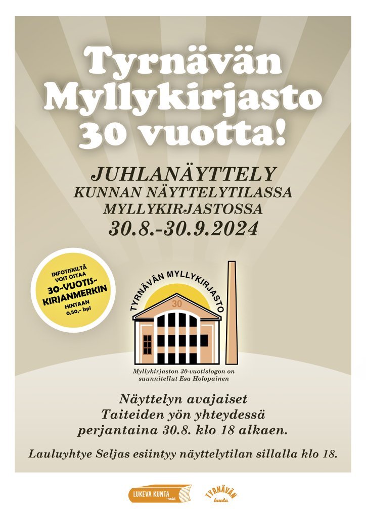 30.08.2024 18:00 - 30.09.2024 12:00 Tyrnävän Myllykirjasto 30 vuotta! -näyttely 30.8.-30.9.2024 Vuonna 2024 Tyrnävän upea Myllykirjasto täyttää 30 vuotta! Juhlavuoden kunniaksi Tyrnävän kunnan näyttelytilassa nähdään Myllykirjaston 30-vuotisnäyttely. Juhlavuoden logon on suunnitellut sarjakuvataiteilija Esa Holopainen.