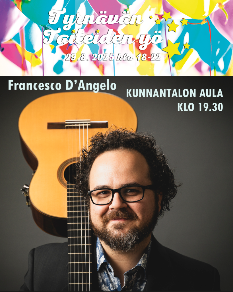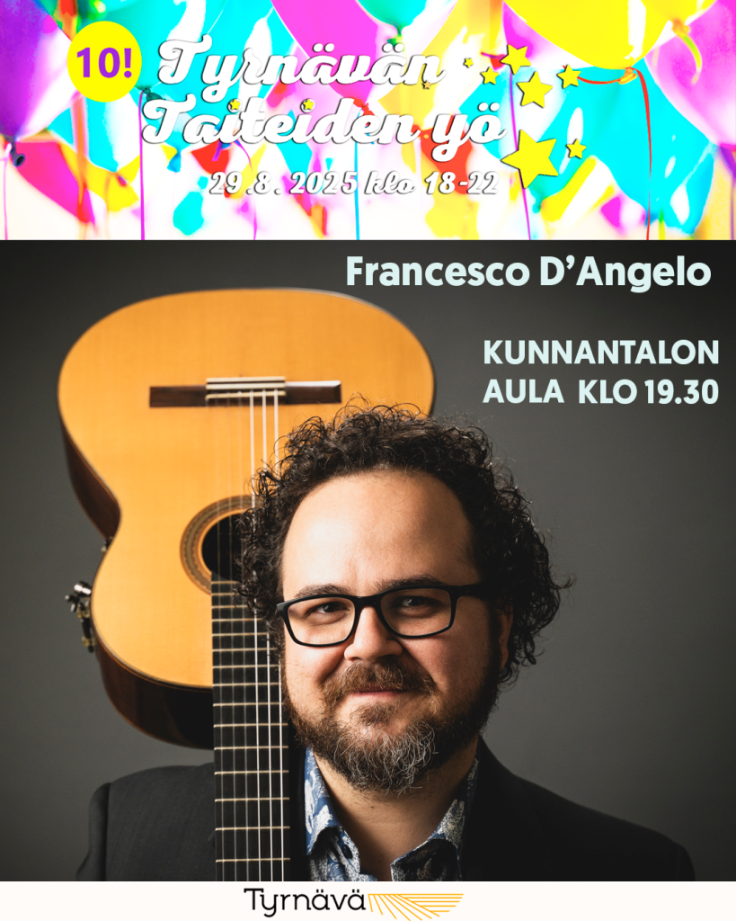 29.08.2025 19:30 - 29.08.2025 20:40 Tyrnävän Taiteiden yö pe 29.8.2025: Francesco D'Angelo. Kunnantalon aula klo 19.30 Tyrnävän Taiteiden yö pe 29.8.2025: Francesco D'Angelo. Kunnantalon aula klo 19.30 Kunnantalon aulassa voi kokea italialaisen oopperamatkan kitaristina Francesco D'Angelo. Kesto 70 min. Italialainen oopperamatka kitaralla läpi 1800-luvun herättää henkiin klassisen ja romanttisen kitaransoiton pitkän ja elävän perinteen italialaisen oopperan koskettavimpien ja värikkäimpien ilmaisujen kautta. Opperamatkalle kitaralla meidät vie Pisassa 1991 syntynyt Francesco D’Angelo, joka on kitaristi (klassinen ja sähkökitara) sekä säveltäjä ja opettaja Kuusamon musiikkiopistossa. Hänellä on taustallaan vapaan improvisoinnin, modernin musiikin sekä klassisen musiikin vahva koulutus. D’Angelo aloitti enonsa innoittamana musikaalisen polkunsa leikkien ja improvisoiden ollessaan kymmenvuotias. Hän jatkoi opiskelemaan Multimediaisen musiikin lukioon “P. Passaglia” Luccan kaupungissa. Lukion jälkeen Francesco opiskeli P. Mascagni -konservatoriossa Livornossa, missä hän suoritti erinomaisin arvosanoin ensimmäisen ja toisen asteen tutkinnot klassisessa kitarassa opettajanaan Nuccio D’Angelo.