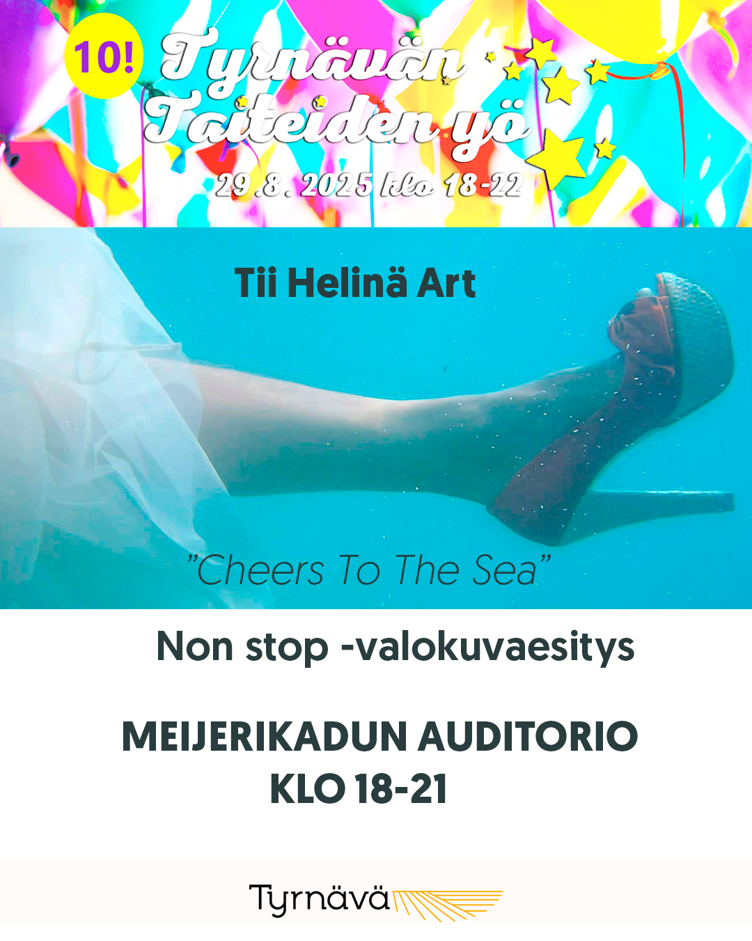 29.08.2025 18:01 - 29.08.2025 21:00 Tyrnävän Taiteiden yö pe 29.8.2025 klo 18-22: Tii Helinä Art: Cheers To The Sea. Non stop -valokuvaesitys. Meijerikadun auditorio klo 18-21. Tyrnävän Taiteiden yö pe 29.8.2025 klo 18-22: Tii Helinä Art: Cheers To The Sea. Non stop -valokuvaesitys. Meijerikadun auditorio klo 18-21. www.tiihelina.com