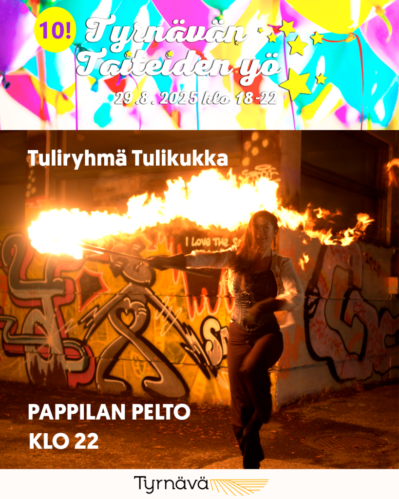 29.08.2025 22:00 - 29.08.2025 22:15 Tyrnävän Taiteiden yö pe 29.8.2025 klo 18-22: TULIKUKKA: tuliesitys. Klo 22 Pappilan pelto Tyrnävän Taiteiden yö pe 29.8.2025: TULIKUKKA klo 22 Pappilan pelto Tyrnävän Taiteiden yön päättää perinteiseen tapaan Pappilan pellolla nähtävä tuliesitys, jonka jälkeen paikalla poltetaan olkipukki. Tuliryhmä Tulikukan lumoava tuliesitys Pappilan pellolla klo 22 alkaen. Huomioithan oman ja muiden turvallisuuden noudattamalla paikan päällä olevia ohjeita. Pysy turva-aidan ulkopuolella. Vanhemmat valvokaa lapsianne.