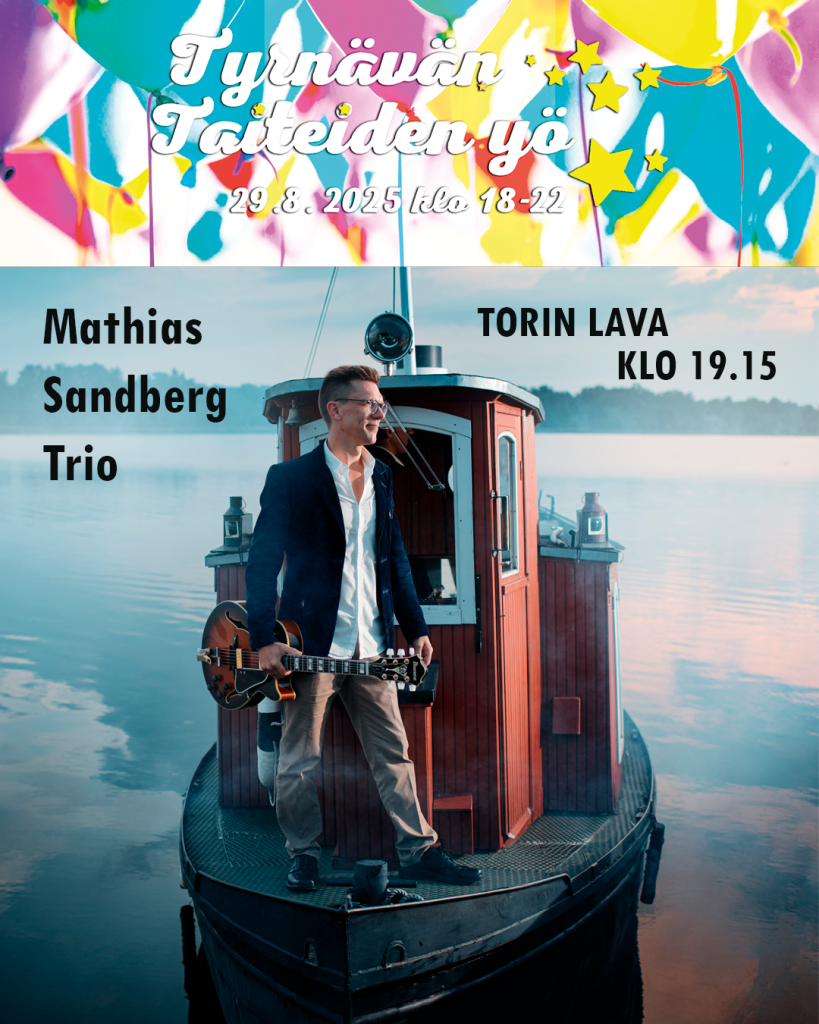 29.08.2025 19:15 - 29.08.2025 20:15 Tyrnävän Taiteiden yö pe 29.8.2025: Mathias Sandberg Trio. Torin lava klo 19.15 Tyrnävän Taiteiden yö pe 29.8.2025: Mathias Sandberg Trio. Torin lava klo 19.15 Mathias Sandberg Trio Mathias Sandberg, kitara Zacharias Holmkvist, kontrabasso Stefan Brokvist, rummut Jazzkitaristi ja säveltäjä Mathias Sandberg, jota amerikkalaisessa musiikkilehdessä Jazziz Magazine on kutsuttu "yhdeksi Suomen parhaiten varjelluista salaisuuksista", kuuluu maamme aktiivisimpiin jazzmuusikoihin. Mathias Sandbergin debyytti-soololevy The Doctor (2020) ja pitkään odotettu triolevy The Captain (2023) ovat saaneet ylistäviä arvosteluja molemmilla puolilla Atlanttia ja niitä on soitettu ahkerasti jazzradiokanavilla Euroopassa, Yhdysvalloissa, Etelä-Amerikassa, Aasiassa ja Australiassa. Konsertissa kuullaan trion omalaatuista ”hard swingin', groovy & soulful jazz”-sekoitusta vahvoilla melodioilla, rytmisesti leikkisää improvisaatiota ja lähes telepaattista yhteissoittoa. www.sandbergmusic.com