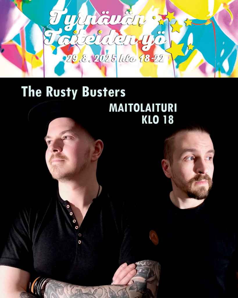 29.08.2025 18:01 - 29.08.2025 19:00 Tyrnävän Taiteiden yö pe 29.8.2025: The Rusty Busters. Maitolaituri klo 18 Tyrnävän Taiteiden yö pe 29.8.2025: The Rusty Busters. Maitolaituri klo 18. The Rusty Busters johdattelee yleisönsä akustisiin tunnelmiin 80-luvulta tähän päivään. Duon muodostavat veljekset Severi ja Aappo Varanka. Kappaleet vaihtelevat menevistä akustisista rock-covereista herkkiin tulkintoihin sekä hittibiiseistä että vähemmän tunnetuista helmistä. IG: therustybusters