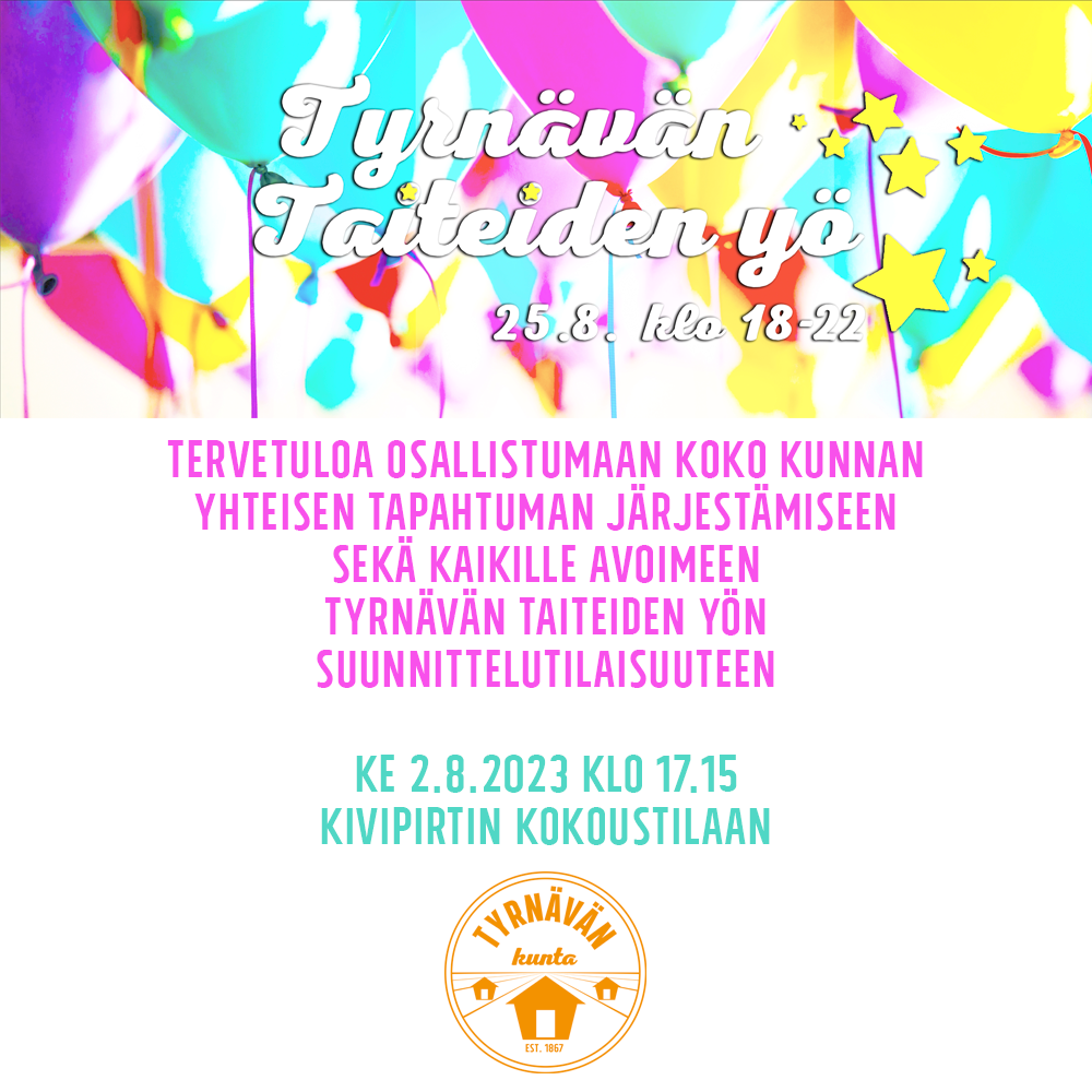 02.08.2023 17:15 - 02.08.2023 18:30 Tyrnävän Taiteiden yön suunnittelutilaisuus Tervetuloa osallistumaan koko kunnan yhteisen tapahtuman järjestämiseen sekä kaikille avoimeen Tyrnävän Taiteiden yön suunnittelutilaisuuteen ke 2.8.2023 klo 17.15 Kivipirtin kokoustilaan Myllykirjastolle.