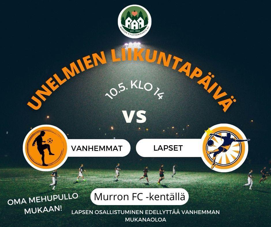 10.05.2025 14:00 - 10.05.2025 15:00 Unelmien liikuntapäivän vanhemmat vs. lapset -jalkapallopeli Vanhemmat vs. lapset -jalkapallopeli 10.5. klo 14 Murron fc-kentällä (nurmikenttä Pikkaralantien ja Murrontien risteyksessä). Lapsen osallistuminen edellyttää vanhemman mukanaoloa. Järjestäjä: Murron kylätoimikunta
